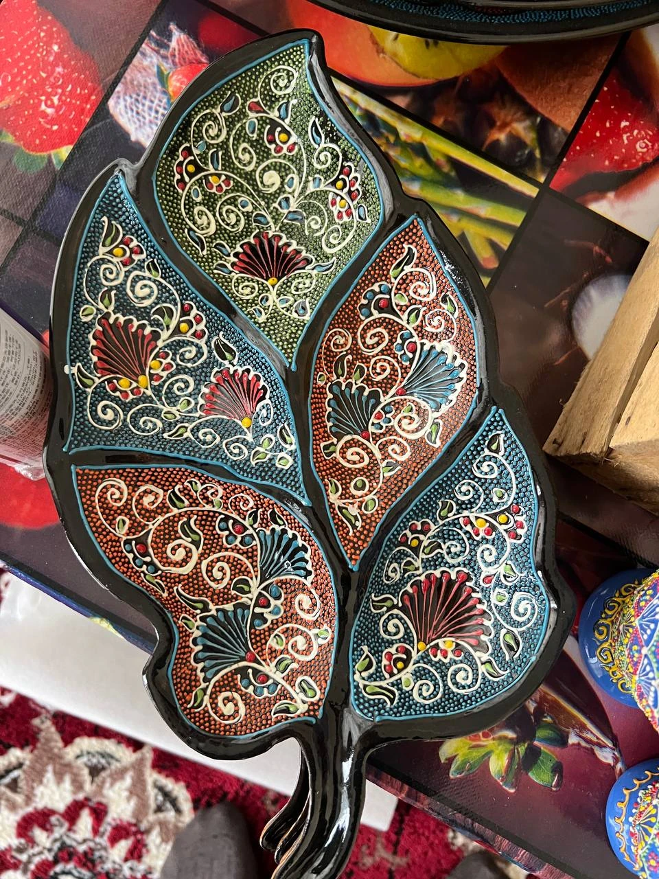 This image features a handcrafted Uzbek ceramic decorative plate (lagan) with the word “TASHKENT” painted at the center in bold artistic lettering. Design & Ornamentation Shape: round plate with a smooth surface and a slightly raised rim Art style: traditional Uzbek ethnic ceramic artistry Motifs include: Paisley (buta) ornaments Floral mandala composition at the center Islimi (curved vine) decorative elements Symmetrical geometric segments forming a star-like pattern Technique: hand-painted dotwork (nuqta naqsh) combined with fine contour ornament painting Pattern layout: layered, symmetrical, and carefully balanced Color Palette Base glaze: deep glossy black ceramic finish Ornament colors: gold, red, yellow, orange, turquoise, and green accents Background texture: dense decorative dotwork for a rich, premium handcrafted look Material & Craftsmanship Material: high-quality natural ceramic clay Production: 100% hand-molded and hand-painted Finish: glossy protective glaze for durability and elegant appearance Uniqueness: each plate is one-of-a-kind, with minor natural artistic variations Use note: ideal for decorative display or serving dry foods and sweets (not recommended for liquid serving unless inner-coated) Best For Home interior décor (traditional or modern spaces) Cultural display in cafés, hotels, galleries, offices, and craft stores Artisan heritage gifts Table styling for sweets, dried fruits, nuts, or snacks Cultural & Market Value This ceramic plate represents Uzbek cultural heritage and artisan craftsmanship, combining authentic ethnic motifs, symmetry, and premium handmade artistry — perfect for customers who value traditional elegance and handcrafted décor with cultural identity.