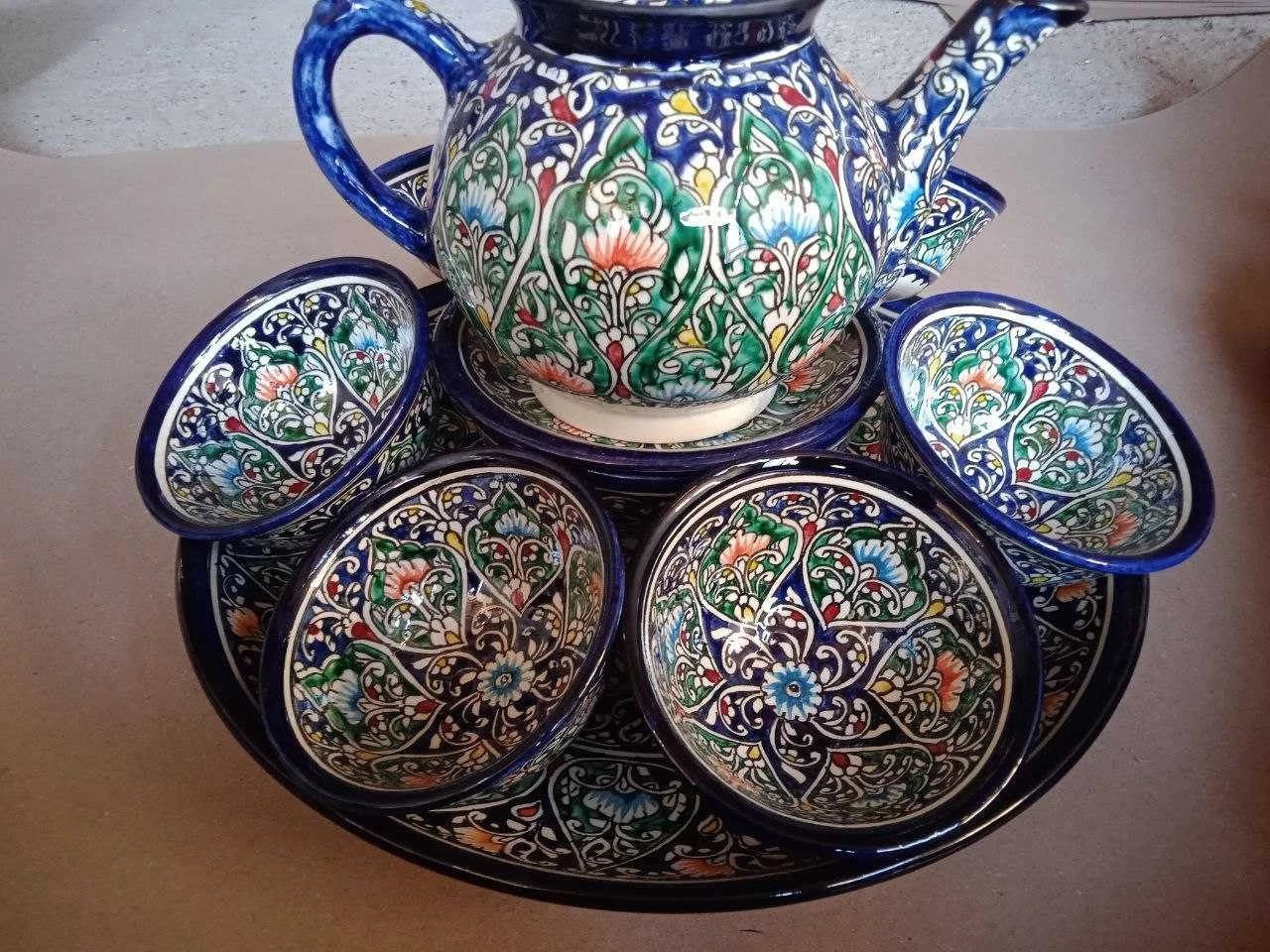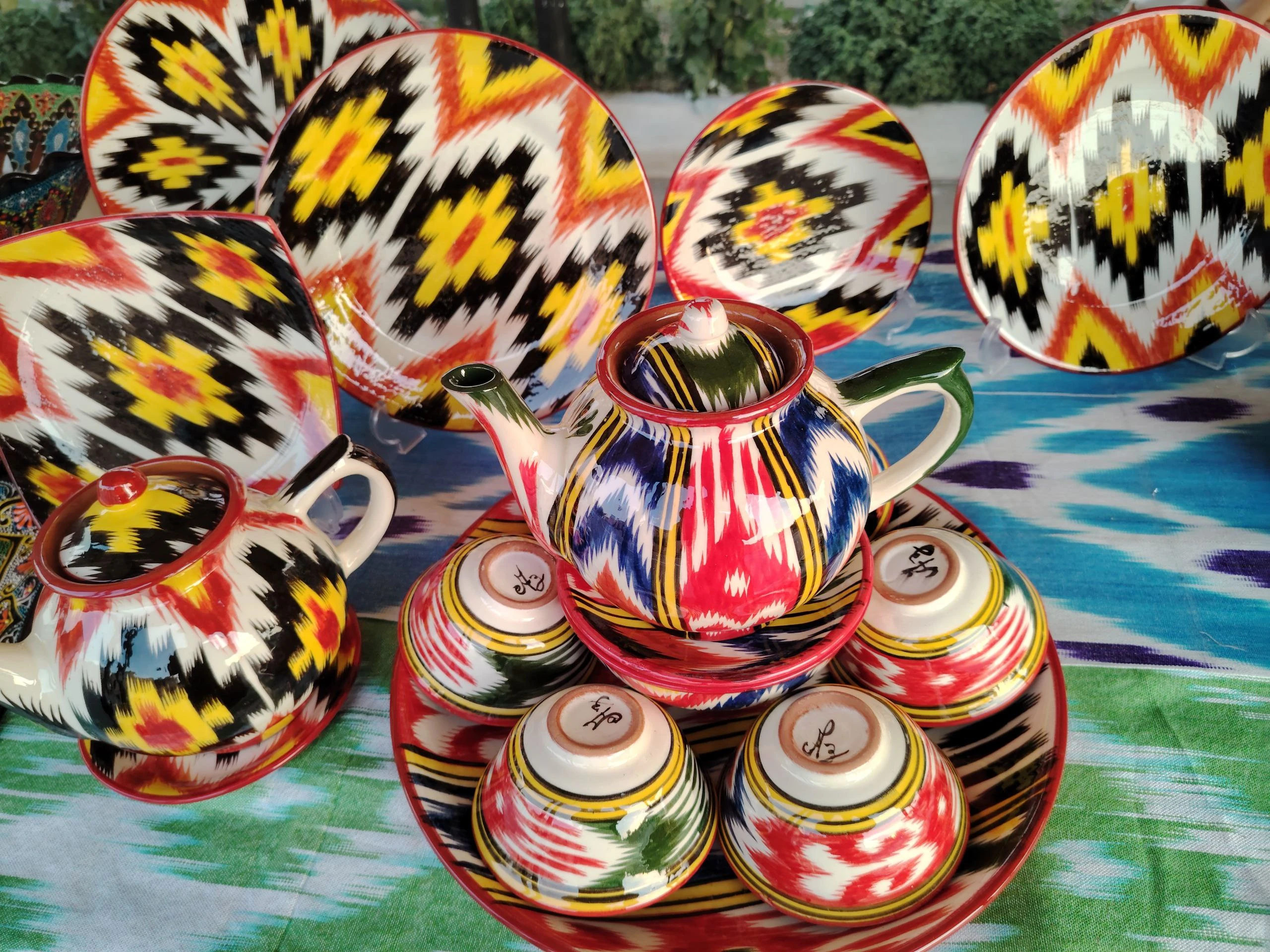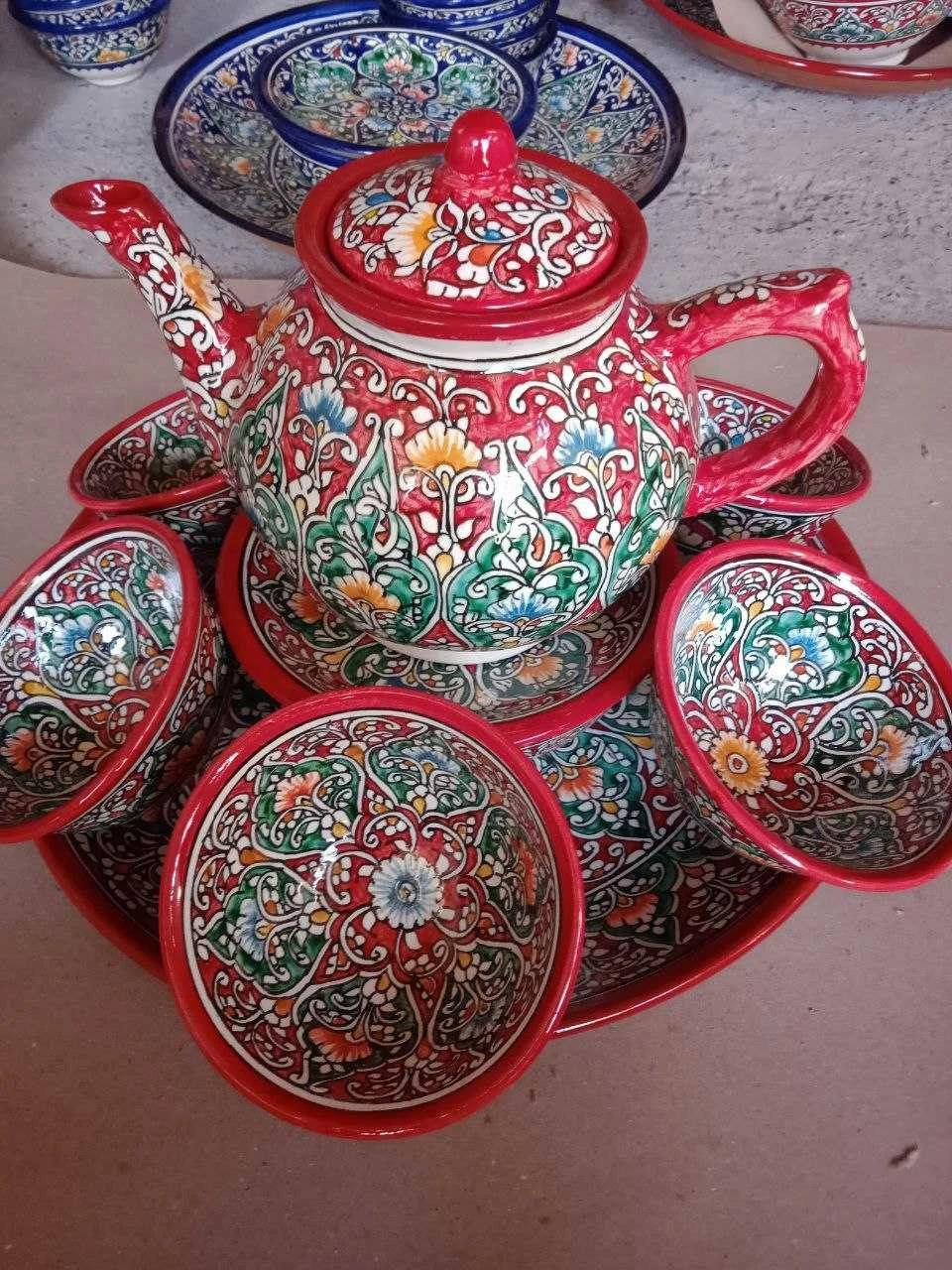 This elegant tea set features a teapot, cup, saucers, and a bowl, all decorated with a stunning atlas-inspired Uzbek pattern. The design reflects rich cultural heritage with smooth lines, vibrant ornaments, and a timeless aesthetic.