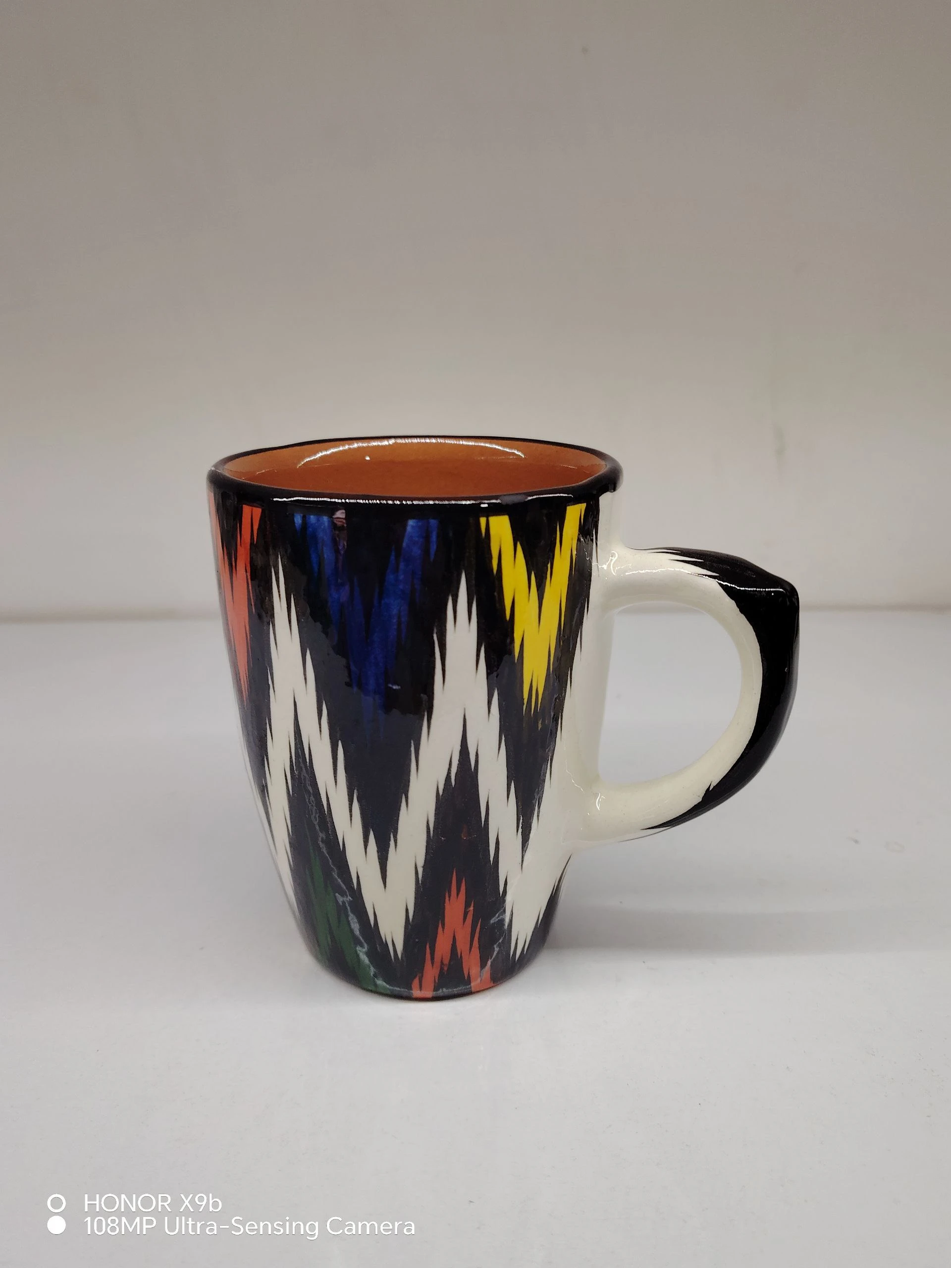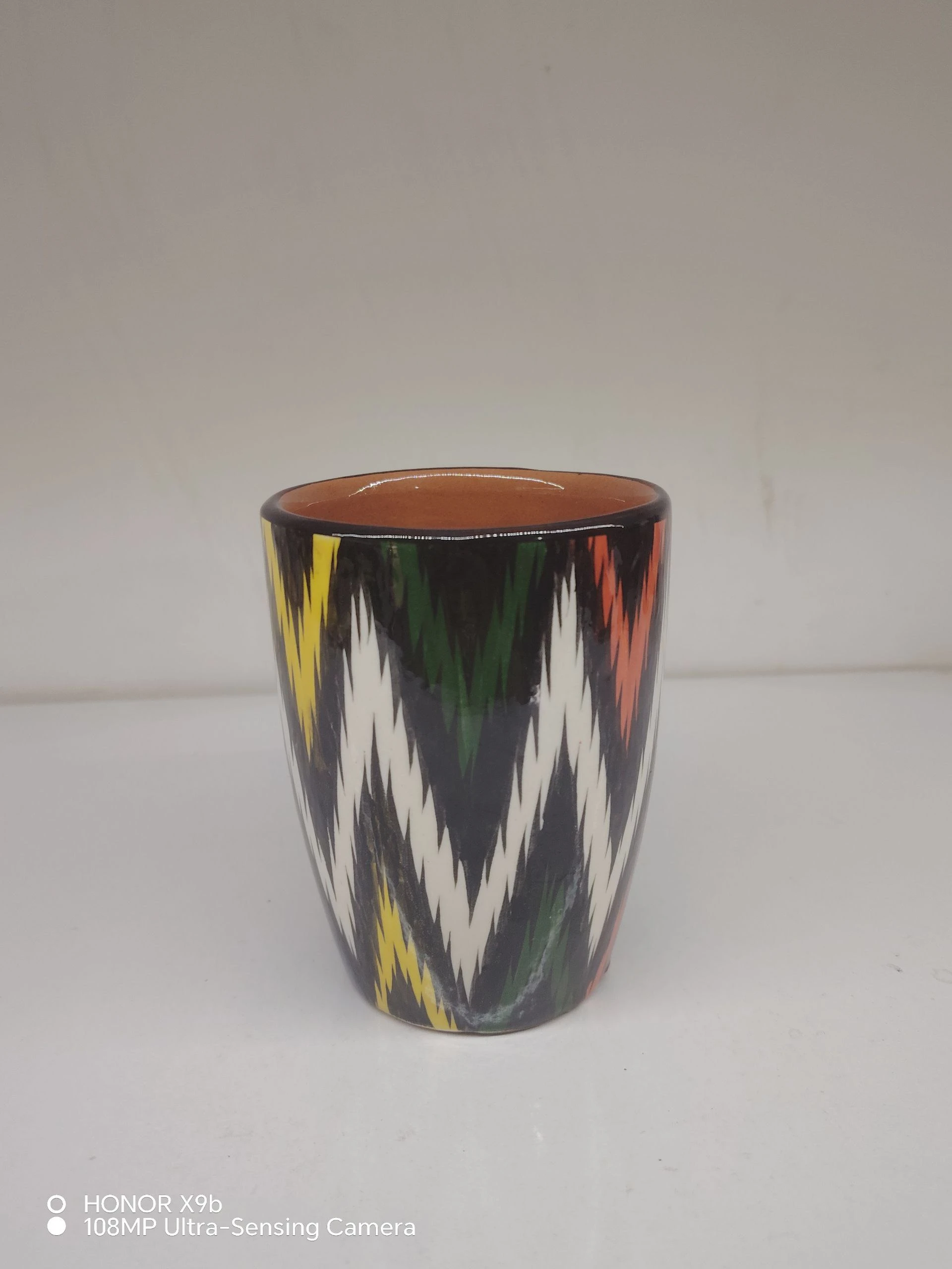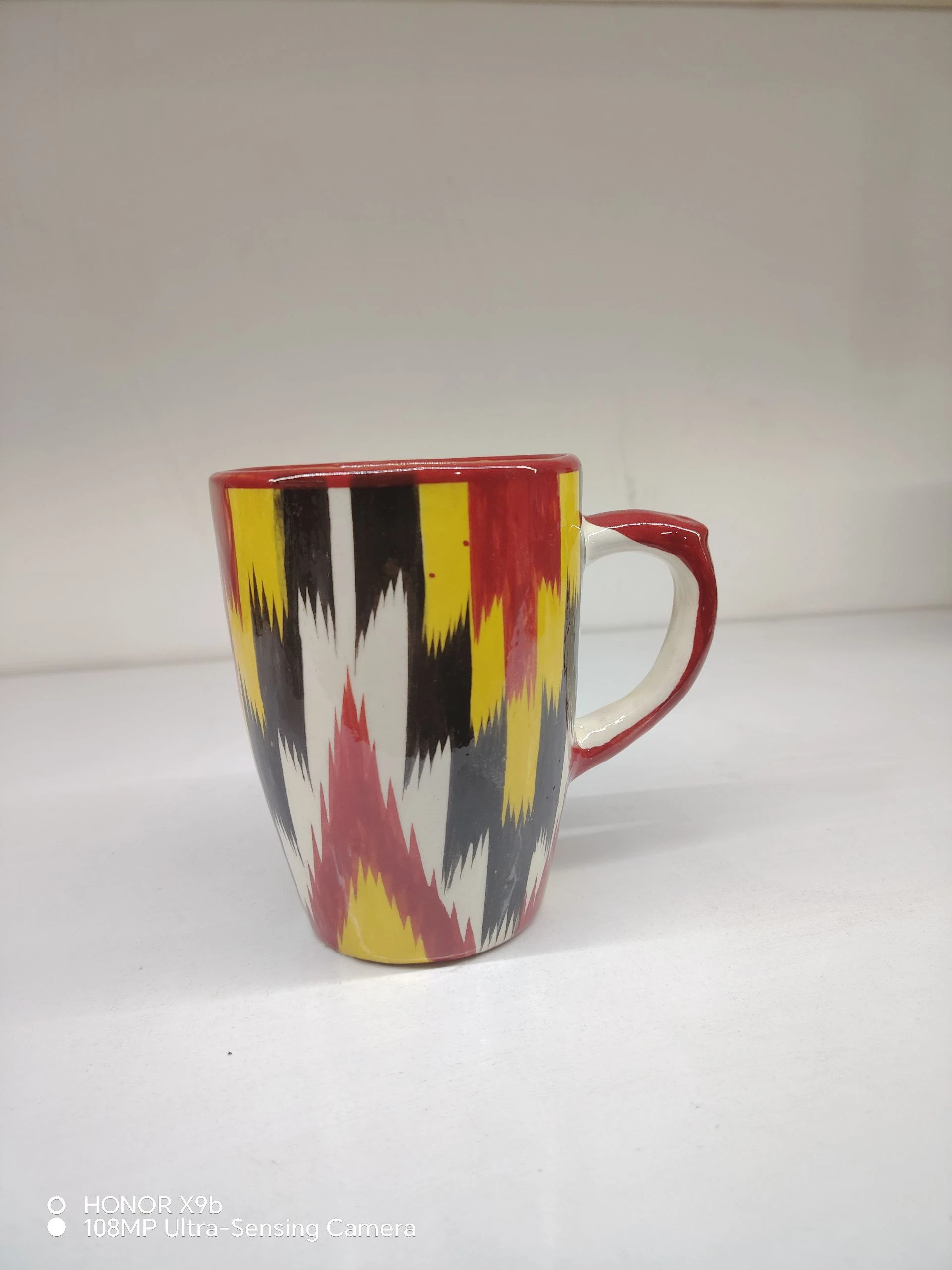 This handcrafted ceramic tableware set is decorated with a vibrant traditional Uzbek atlas pattern, featuring bold zigzag ornaments in rich color combinations such as deep red, black, yellow, blue, and green. Each piece has a glossy finish and a warm clay-toned interior, giving it a premium artistic look.