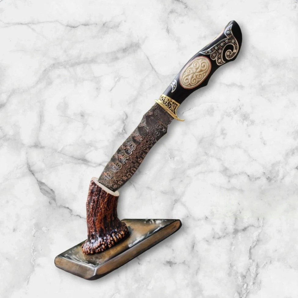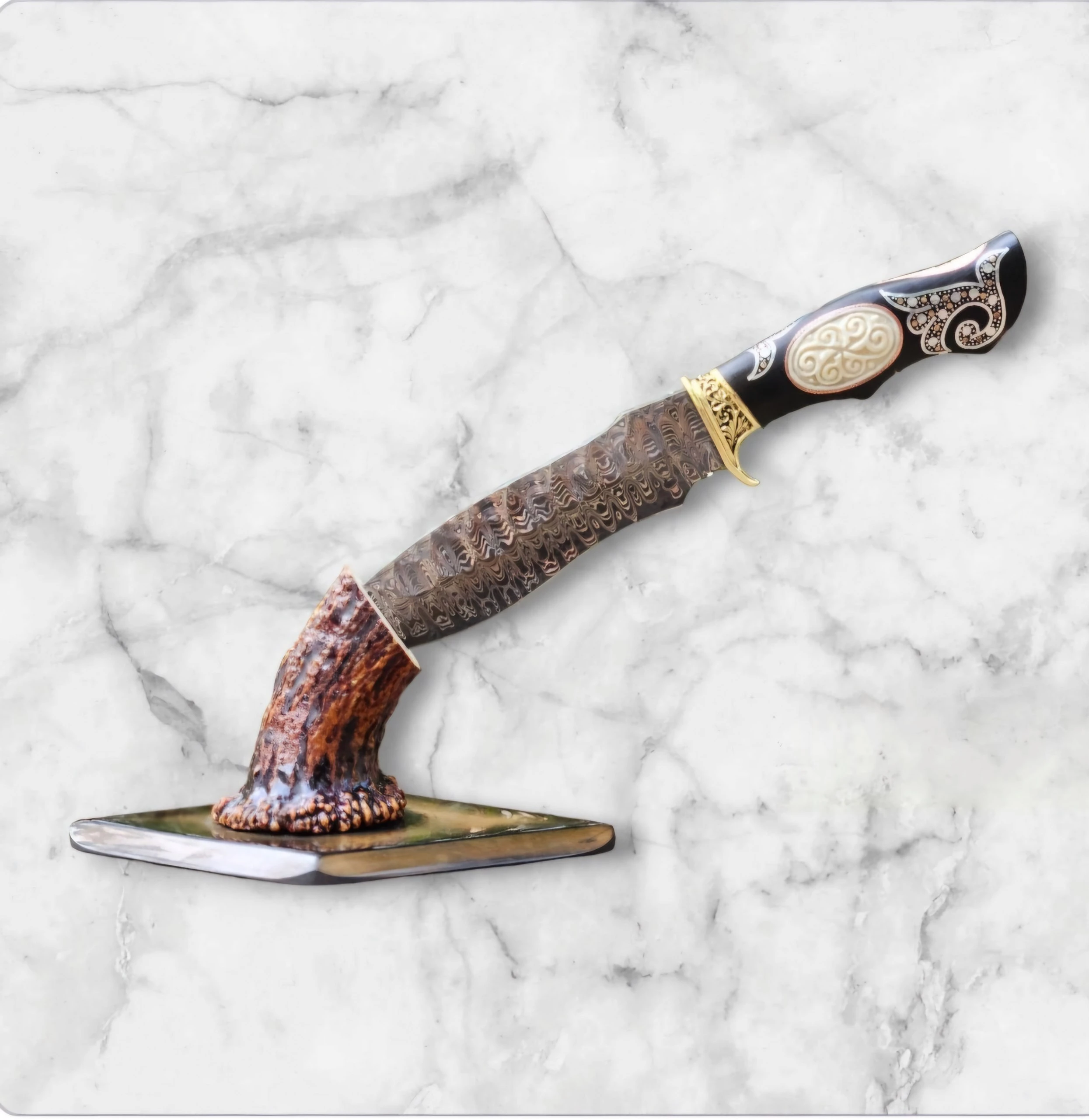 High-quality Damascus steel kitchen knives with natural wooden handle. Blade length of 17-18 cm and handle of 12 cm, with a babbit bolster.