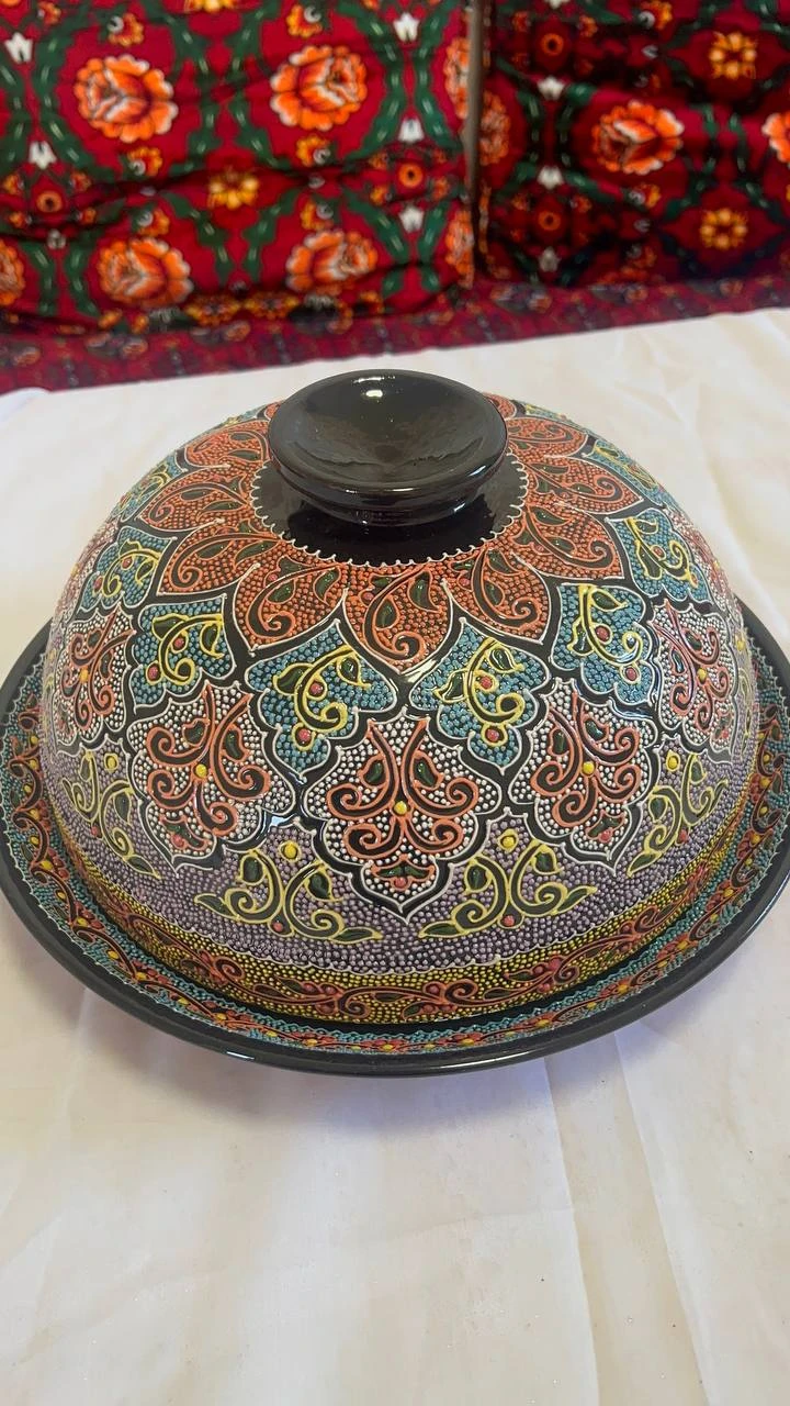 This is a handmade Uzbek ceramic mug crafted from natural clay and coated with a glossy cobalt-blue glaze. It features traditional Uzbek ornamental patterns in raised relief, created using a fine dot-painting (nuqta naqsh) and contour technique. Design Elements Motifs: geometric arches, floral accents, and diamond-grid patterns inspired by classic Uzbek art Texture: raised 3D relief details that are smooth to touch Handle: curved ergonomic ceramic handle for comfortable grip Base interior: soft natural ceramic tone (beige/cream), left unpainted for contrast Rim: decorative painted border along the top and bottom edges Color Palette Main color: glossy cobalt/indigo blue Pattern colors: red, yellow, gold, and green dotted ornaments with symmetrical layout Inner cup: smooth unpainted ceramic finish in soft beige Material & Craftsmanship Material: high-quality ceramic clay Technique: 100% hand-molded and hand-decorated Glaze finish: glossy protective coating for durability Heat-resistant: suitable for hot and cold beverages Uniqueness: minor pattern variations may appear due to handmade nature Best For Tea, coffee, milk, and other beverages Home décor or shelf display Cultural gifts with artisan heritage value Use in cafés, hotels, offices, or traditional interior spaces Cultural Value This mug reflects authentic Uzbek ceramic artistry, combining heritage patterns, vibrant hand-painted details, and a premium handcrafted aesthetic.