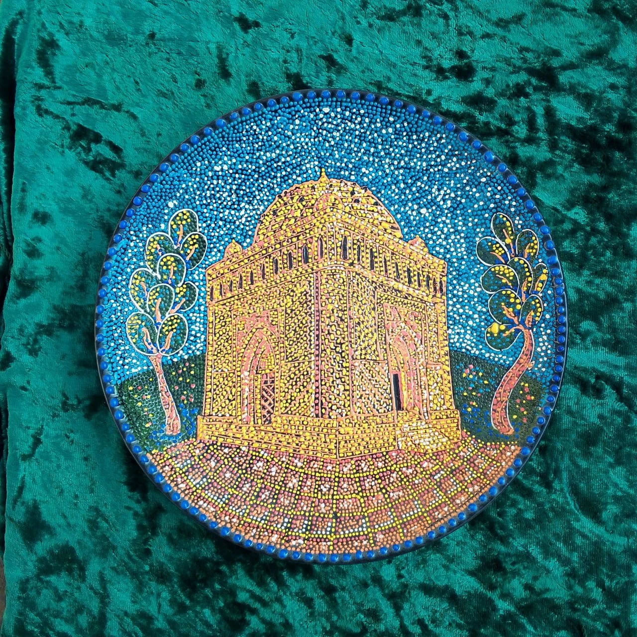 The 'Decorative Plate Ismail Samani Mausoleum' is a refined ceramic artwork inspired by the iconic architectural monument located in the historic city of Bukhara, Central Asia. This composition features a stylized depiction of the Ismail Samani Mausoleum, embodying wisdom, continuity, and rich spiritual heritage. Rendered in warm golden and earthy tones, it emphasizes architectural harmony. The landscape includes decorative trees and a rhythmic dotted pattern, evoking the sky's depth and nature's serenity. A deep blue background created using a pointillist technique enhances the celestial atmosphere, highlighting the monument's timeless significance. Each detail reflects traditional ceramic craftsmanship, making it both decorative and meaningful. Ideal for interior display, it symbolizes Uzbekistan's architectural legacy and artistic tradition. Created by Saidov Narzillo in the Bukhara Region in 2025; size is 30 dm, made from clay, engobe, and colored glaze.