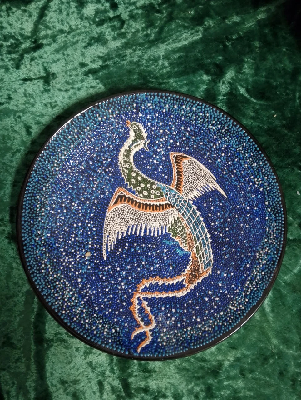 Decorative Plate 'Semurg' is an expressive example of traditional Uzbek ceramic art from the Bukhara region, inspired by ancient Eastern mythology and symbolism. The central image depicts Semurg, the legendary mythical bird, symbolizing rebirth, wisdom, freedom, and spiritual elevation. Its dynamic pose with outstretched wings conveys movement, power, and harmony between earth and sky. The plate’s surface is created using a refined dotted technique, forming a deep blue background reminiscent of a starry night sky or the boundless universe. The contrasting white, turquoise, green, and warm brown tones highlight the elegant silhouette of the Semurg, emphasizing its graceful form and mythical character. The fine detailing of the feathers and tail reflects the artist’s precision, patience, and mastery of traditional ceramic methods. This decorative plate embodies a deep cultural and philosophical meaning while serving as a striking interior art piece. It represents the rich artistic heritage of Uzbekistan and the continuity of ancient symbols through contemporary craftsmanship.