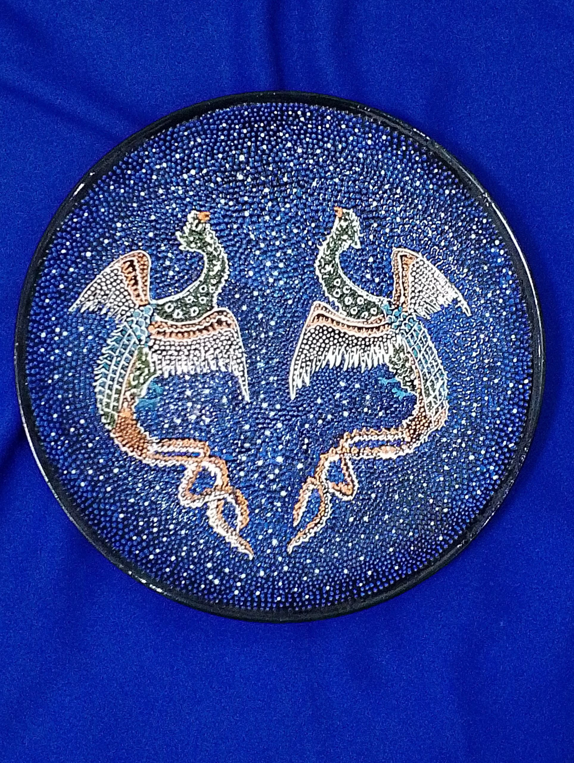 The Decorative Plate "Twin Semurgs" is a symbolic ceramic artwork inspired by ancient Eastern mythology and the traditional artistic heritage of the Bukhara region. The plate features two Semurg birds in perfect symmetry, embodying balance, harmony, unity, and spiritual duality. In Eastern philosophy, the Semurg symbolizes wisdom, rebirth, protection, and life's cyclical nature. The deep blue background, achieved using a meticulous dotted technique, evokes the night sky's vastness. The Semurg figures, rendered in white, turquoise, green, and warm earthy tones, are highlighted against this celestial backdrop, emphasizing their elegance. The symmetry enhances a sense of order and equilibrium. The artist's high craftsmanship level is evident in each detail, transforming the plate into both a decorative object and a meaningful cultural symbol. Ideal for displaying interiors, it represents Uzbekistan’s rich mythological imagery and ceramic traditions.
