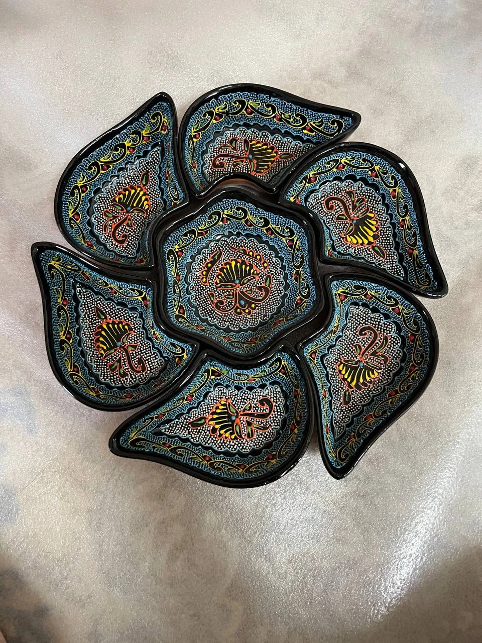 Product Description (ingliz tilida, xatosiz, to‘liq): This is a handcrafted Uzbek ceramic decorative plate (lagan/tarelka) featuring a rich traditional ethnic design. The plate has a unique curved, flower-petal-inspired shape with smooth, glossy black glazed edges. The inner surface is carefully hand-painted using an intricate ornamental composition, which includes: Central paisley (buta) motif Floral decorative elements Fine dot-painting (naqsh nuqtali) technique Gold-accented ornamental curves Color & Pattern Highlights: Base color: deep black ceramic glaze Main ornament colors: gold, yellow, red, orange, and turquoise Design style: symmetrical ethnic motif layout with layered decorative borders Material & Craftsmanship: Material: high-quality ceramic clay Technique: 100% handmade molding + hand painting Finish: glossy glazed exterior, smooth interior surface Edges: artistic curved rim, inspired by traditional handcrafted ceramics Each piece is unique, with slight natural artistic variations due to hand production Suitable for: Traditional or modern home interior décor Cultural display in cafés, hotels, galleries, or craft stores Premium gifting with Uzbek artistic value Serving dry décor items, sweets, or snacks (non-liquid recommended due to decorative design) Cultural Value: This plate represents Uzbek cultural heritage and artisan craftsmanship, combining elegance and ethnic authenticity. A perfect choice for customers who appreciate traditional handmade art with premium aesthetic appeal.