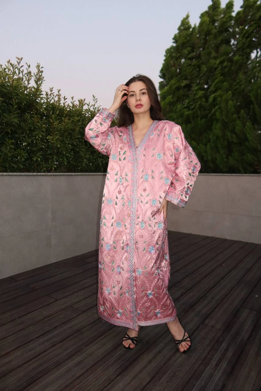 The gentle shine of the fabric reflects the richness of the colors — gold and soft pink, symbolizing prosperity and purity. Lightweight, breathable, and smooth to the touch, this robe drapes beautifully over the body, making it ideal for both everyday comfort and special gatherings.