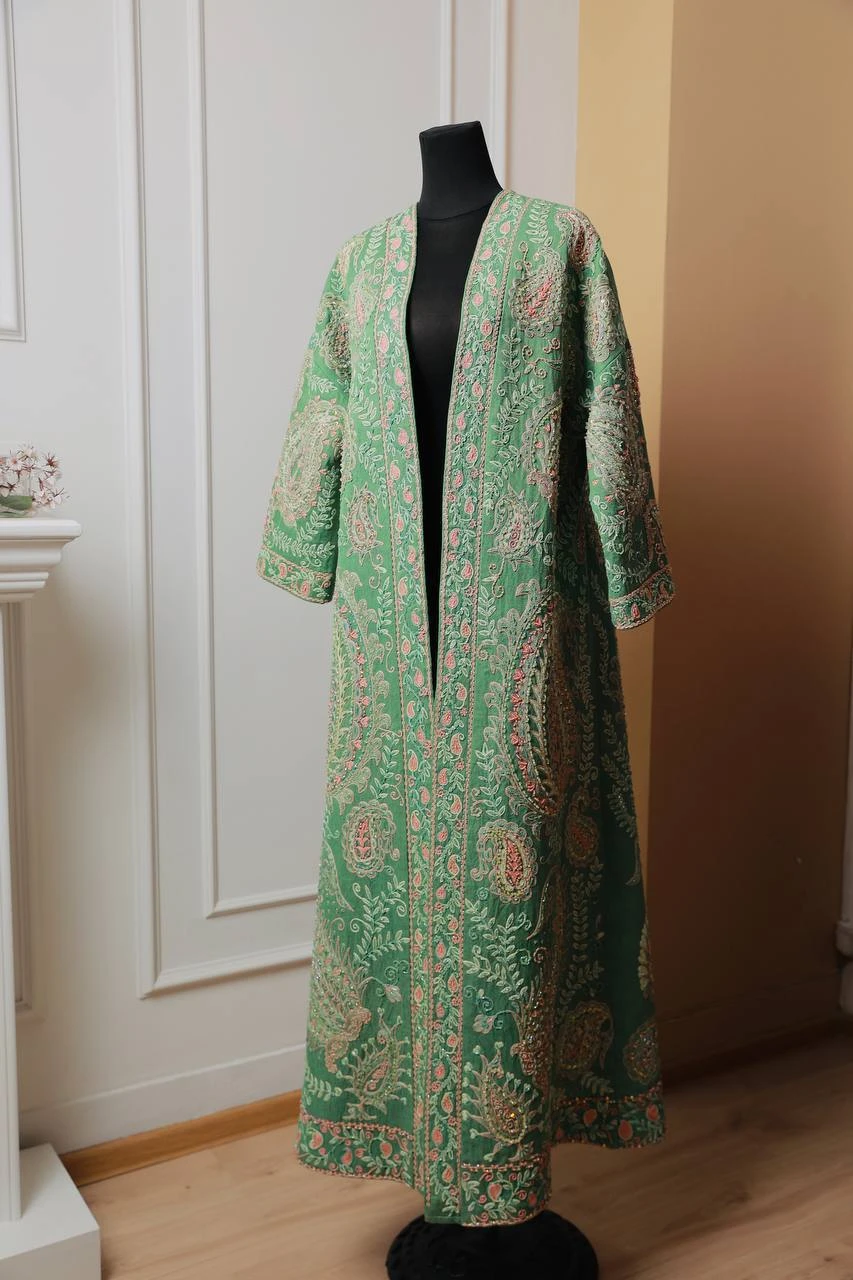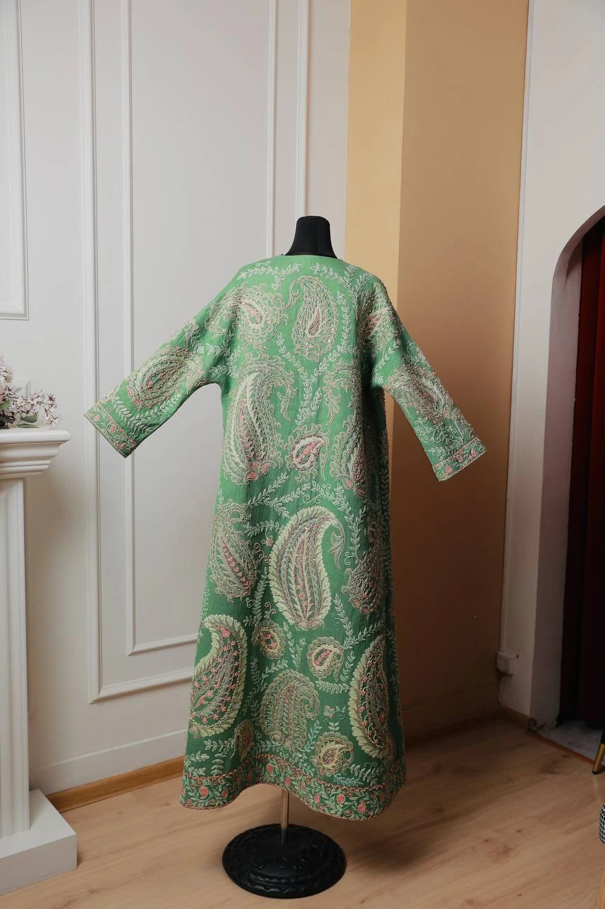 This exquisite piece is a hand-crafted silk suzani, meticulously embroidered with silk thread floral designs. Adorned with Japanese beads for added elegance. The lining is made from ikat shohi adras, providing a luxurious finish.