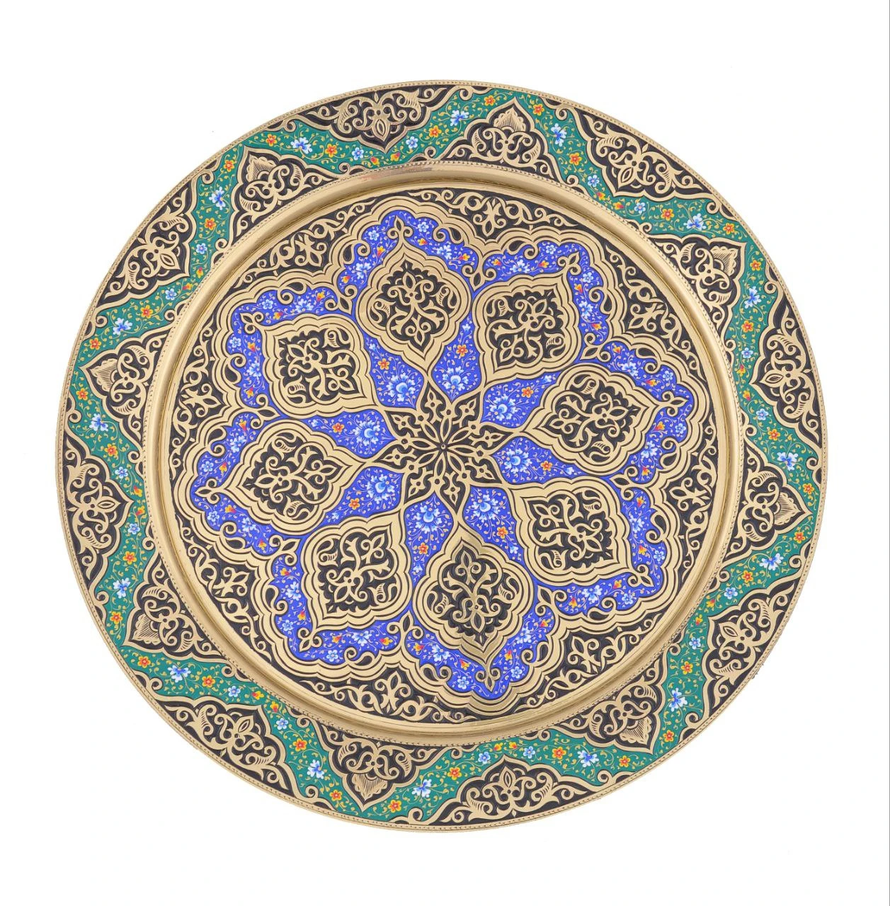 This elegant decorative plate is a refined example of traditional Central Asian ornamental art. The design features a harmonious radial floral composition, enriched with intricate geometric details and delicate hand-painted motifs. A balanced palette of gold, deep blue, turquoise green, and soft floral accents creates a sophisticated and timeless appearance. Each element of the ornament is carefully hand-painted by skilled artisans, reflecting generations of craftsmanship and cultural heritage. The plate is crafted from high-quality metal and finished with a smooth protective coating that enhances durability while preserving the clarity and brilliance of the colors. The detailed symmetry and rich ornamentation make this piece a striking decorative accent. Ideal for wall and interior decoration, luxury home décor, art and cultural collections, and as a prestigious and meaningful gift. This decorative plate is not merely an accessory but a true work of art, bringing elegance, tradition, and timeless beauty into any interior space.