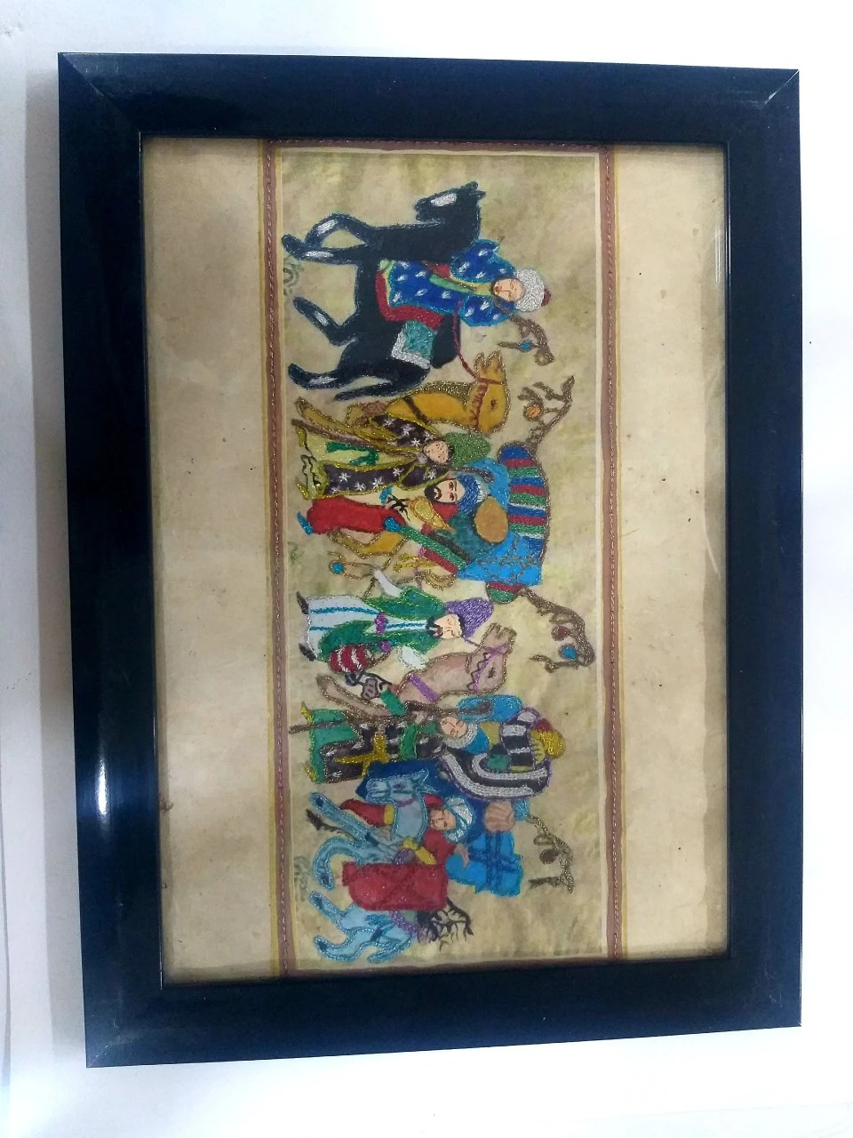This artwork is a handcrafted Uzbek miniature painting displayed in a classic rectangular frame. It illustrates a traditional cultural scene featuring multiple human figures in richly patterned national garments, including atlas and adras-style clothing. The composition includes a black horse and decorative natural elements, creating a dynamic and storytelling atmosphere typical of Central Asian miniature art. The painting is made using fine brush hand-painting techniques on a soft, textured background with earthy beige and light green tones, reflecting an antique artistic aesthetic. The clothing details are colorful and intricate, with striped, floral, and geometric motifs inspired by Uzbek traditional fabrics. The artwork is protected behind glass and bordered by a polished dark wooden frame, giving it a vintage and elegant look. This decorative art piece is ideal for homes, cultural spaces, or gift collections, especially for those who appreciate traditional craftsmanship, heritage storytelling, and handmade artistic expression. Key Features: 100% handmade and hand-painted, Traditional Uzbek cultural illustration, Protected behind glass, Dark wooden frame for a premium vintage aesthetic, Rectangular orientation, wall-mount display.