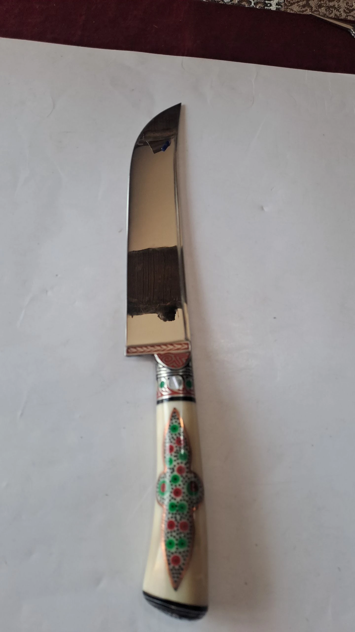 This elegant kitchen knife is fully handcrafted from high-grade stainless steel, offering long-lasting durability, a clean polished edge, and excellent corrosion resistance for everyday use. The blade is forged and finished using traditional metalworking techniques, creating a smooth surface and reliable performance in the kitchen. The handle is made from natural bone, carefully shaped and polished to preserve its authentic texture, giving the knife a classic look and a comfortable grip. A babbitt metal guard is fitted between the blade and the handle to provide balance, safety, and a refined decorative accent. With its combination of stainless steel, natural bone, and handcrafted details, this knife stands out as both a practical kitchen tool and a beautiful artisanal gift. The blade length is approximately 16–17 cm, and the handle length is about 12 cm, making it suitable for everyday cooking while also being a unique collectible item for anyone who appreciates traditional craftsmanship and handmade products.