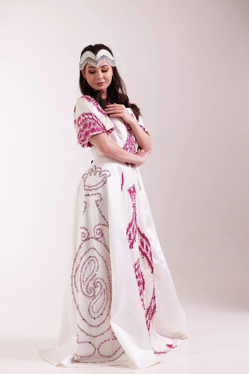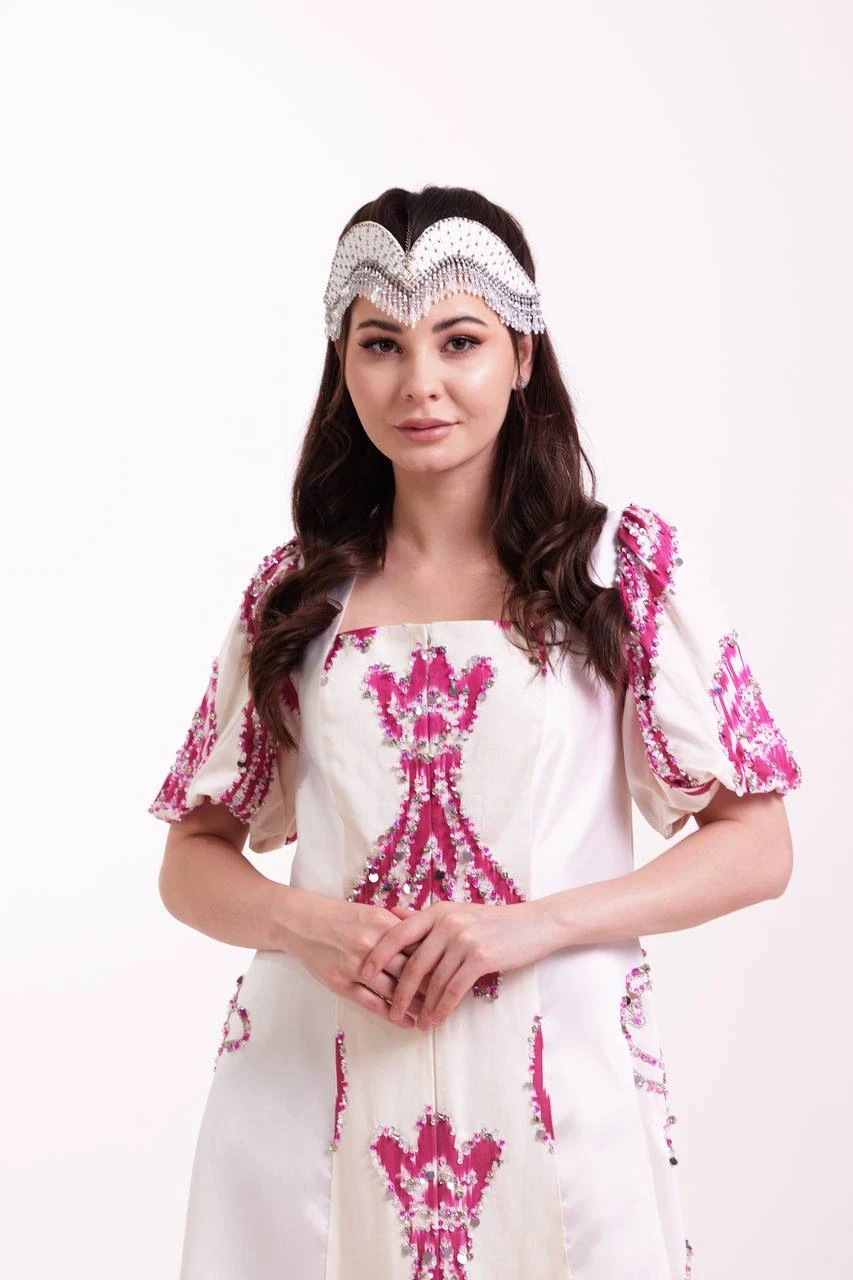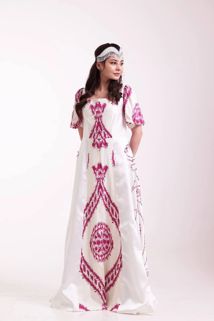 The silhouette is designed to highlight the beauty of natural Ikat forms, allowing the fabric’s rhythm to flow freely across the body. Its elegant drape and soft structure give the piece a feeling of effortless luxury — graceful, but never loud; refined, but never fragile. The decorative elements add depth and radiance, making the dress ideal for ceremonial moments, cultural celebrations, evening occasions or editorial portraits.