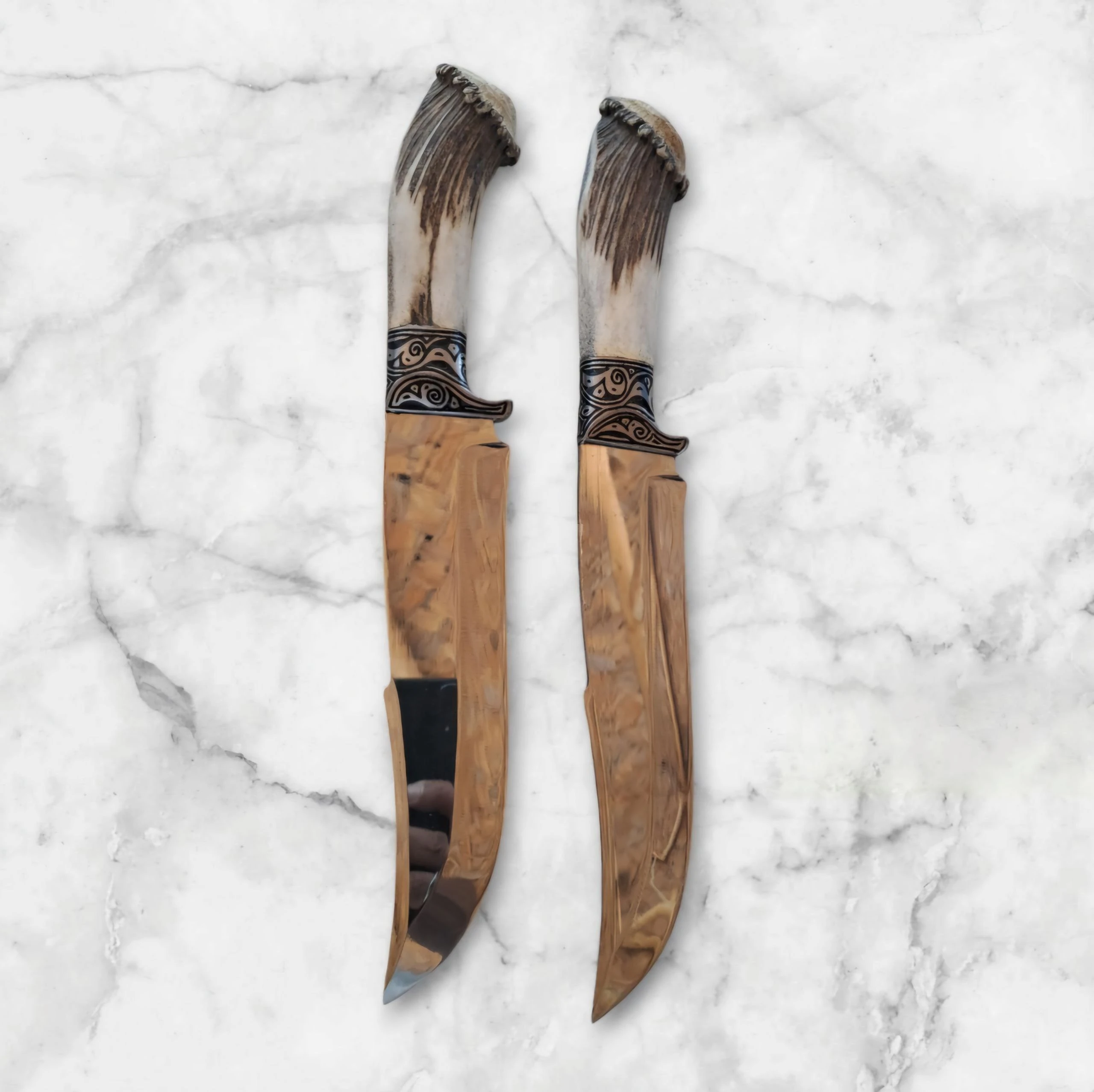 These knives feature a stainless steel blade and a decorative metal clamp with a natural texture. The total length is 22.25 cm with a handle length of 15 cm. Ideal for hunting and as a gift.