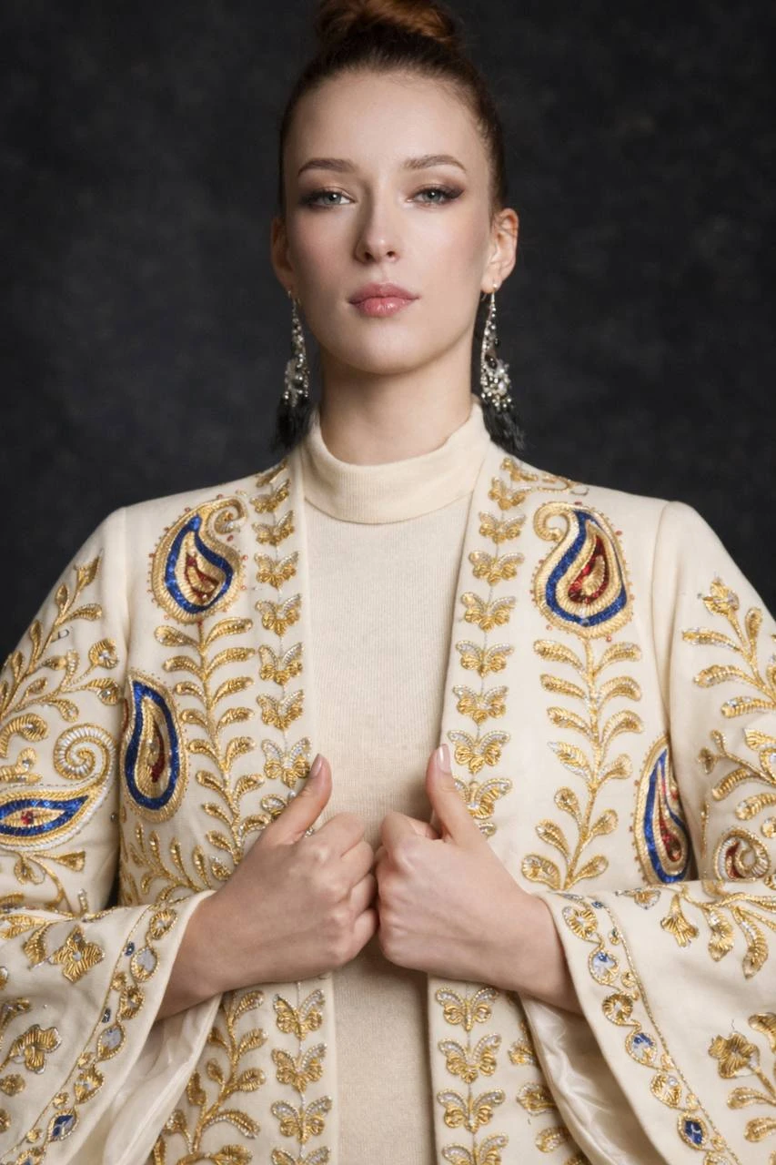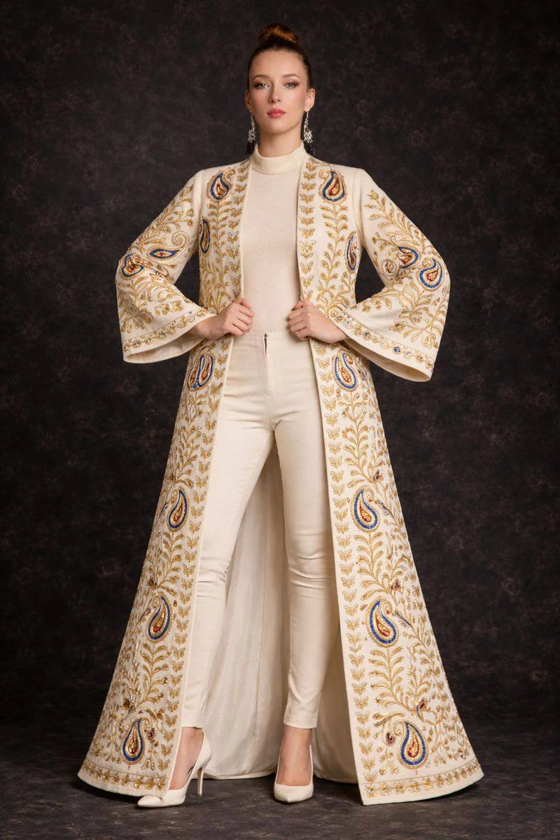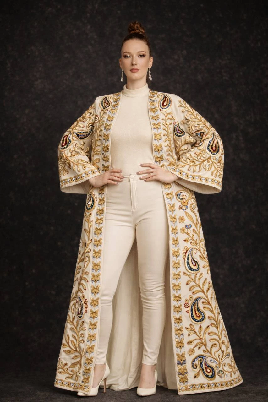 This chapan is crafted with meticulous hand embroidery, emphasizing a clean and well-defined silhouette. Every detail is thoughtfully executed, reflecting precision, balance, and true artisanal skill.