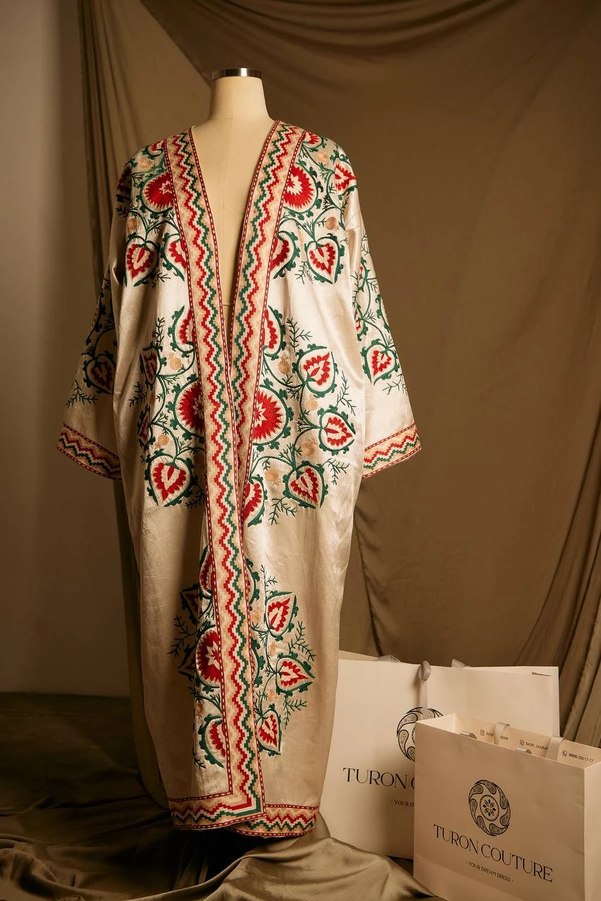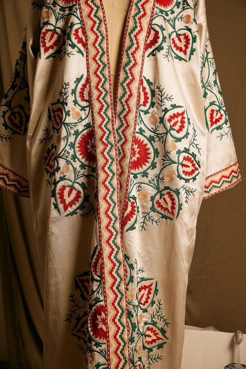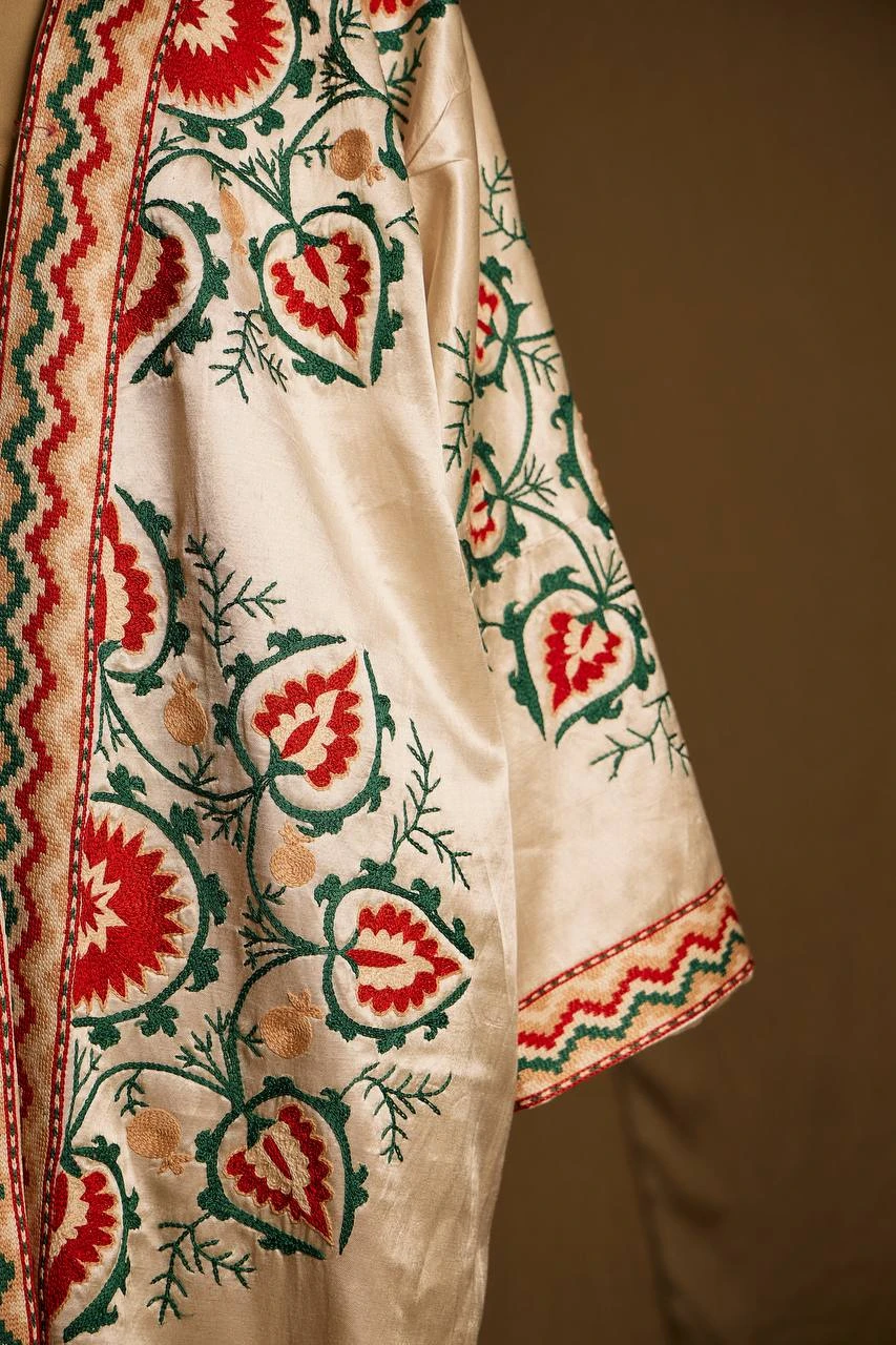 Made from premium satin silk and embroidered entirely by hand with natural silk threads, the chapan has a luminous surface and elegant drape. Each detail is shaped through careful craftsmanship, turning every stitch into part of a cultural narrative.