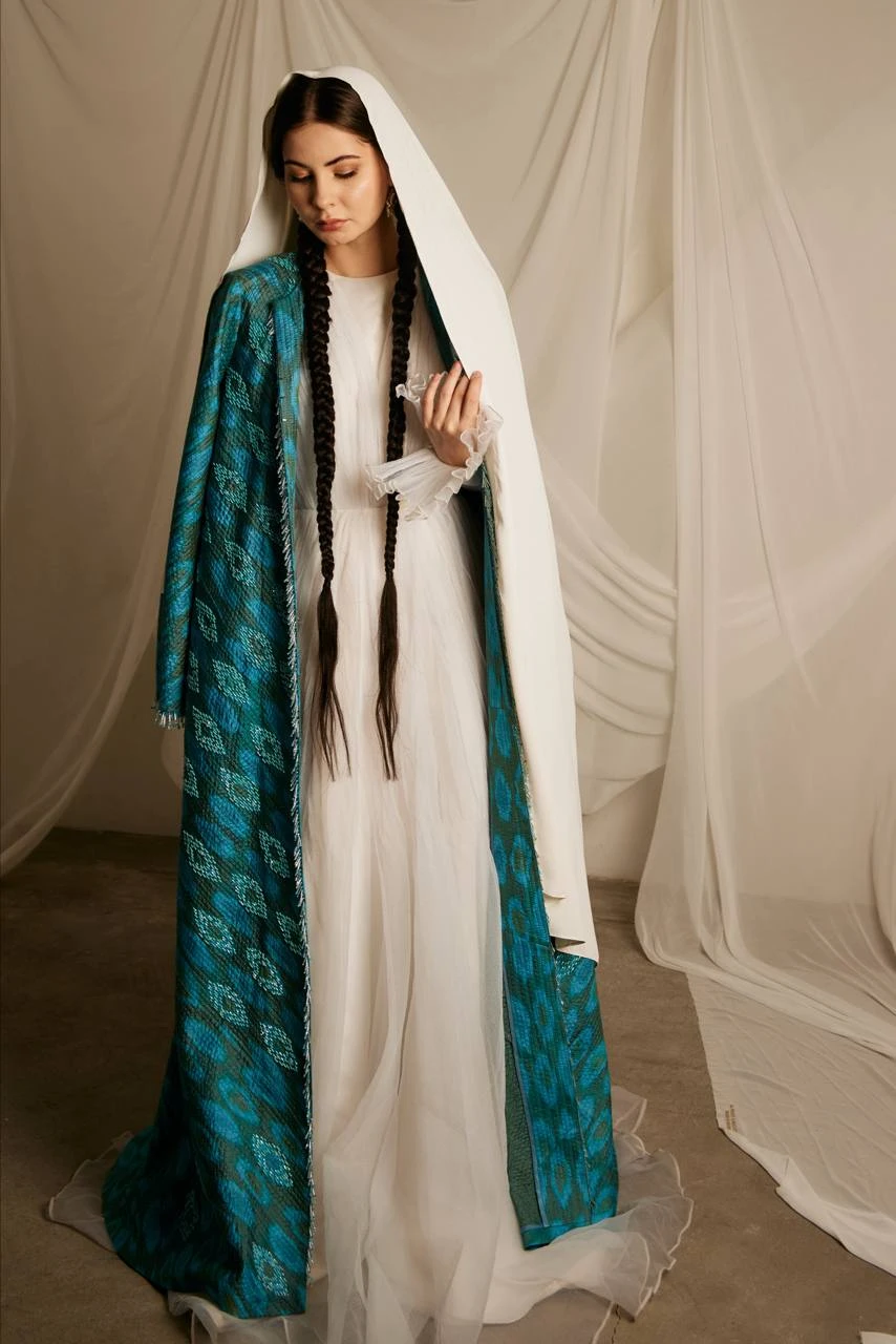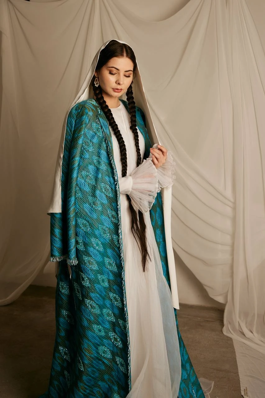 The “Moviy Dengiz” chapan carries emotion in color and identity in pattern. It merges cultural heritage with modern couture sensibility — transforming tradition into an unforgettable visual and sensory experience. A garment like a quiet story: powerful, serene, and created for those who appreciate the depth behind beauty.
