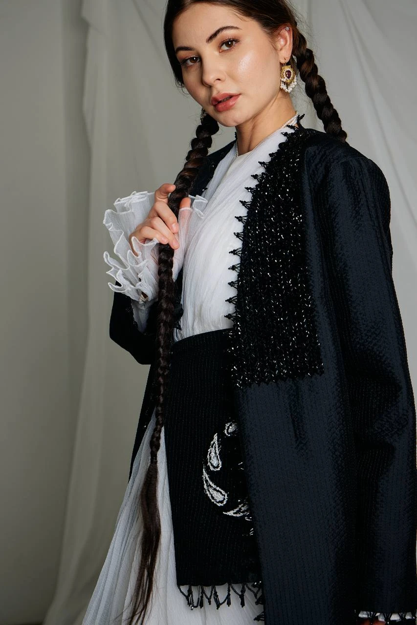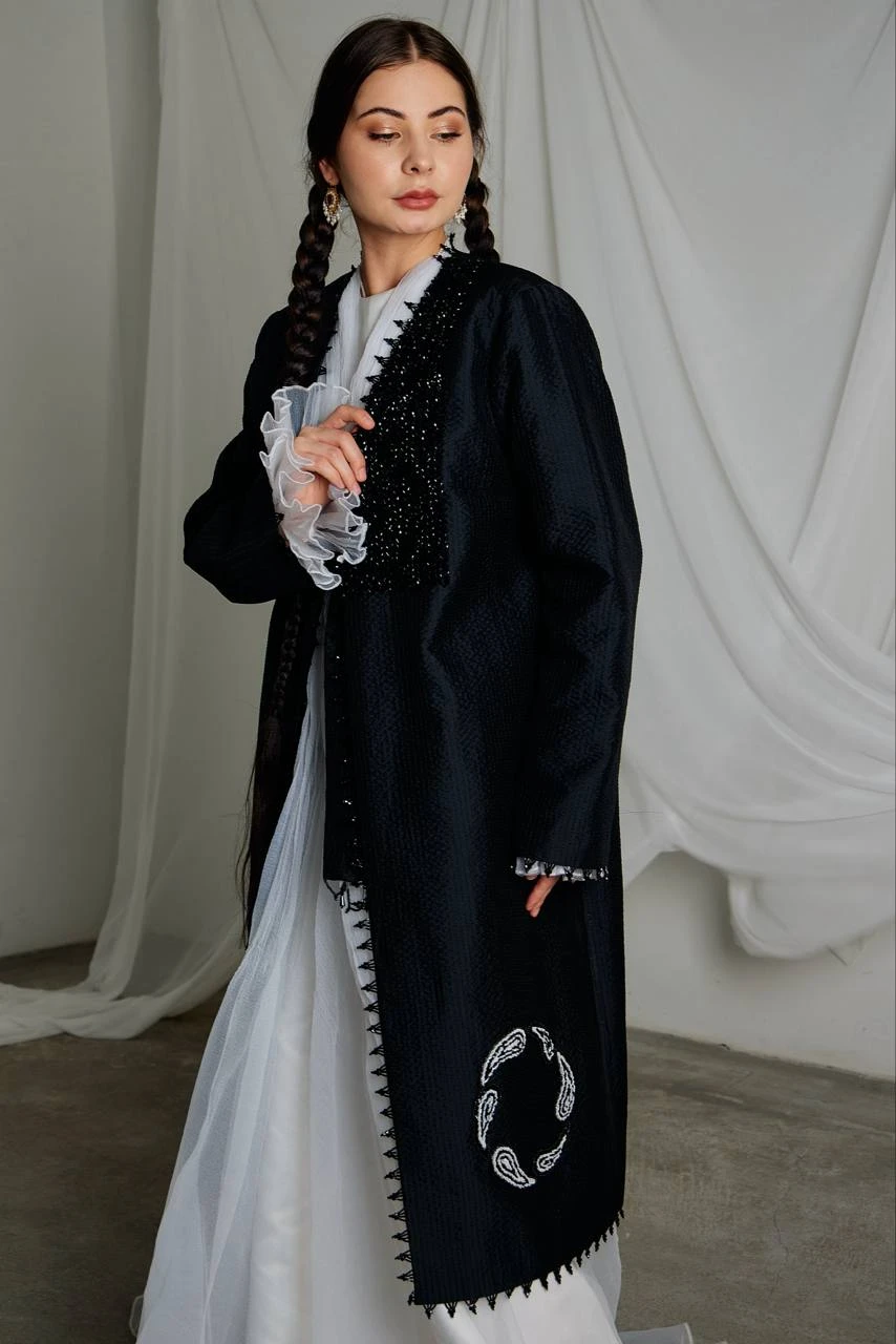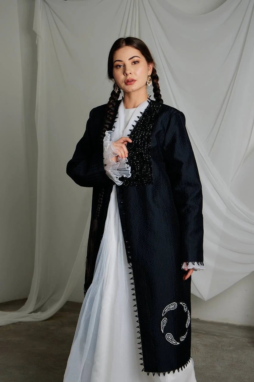 The “Qalampirgul” ensemble represents a dialogue between heritage and modern artistic vision. Crafted entirely by hand, the piece reflects the strength of tradition while embracing a contemporary couture silhouette. The deep black color is intentional — it creates a dramatic contrast that allows form, texture and the rhythm of stitches to speak louder than ornament itself.