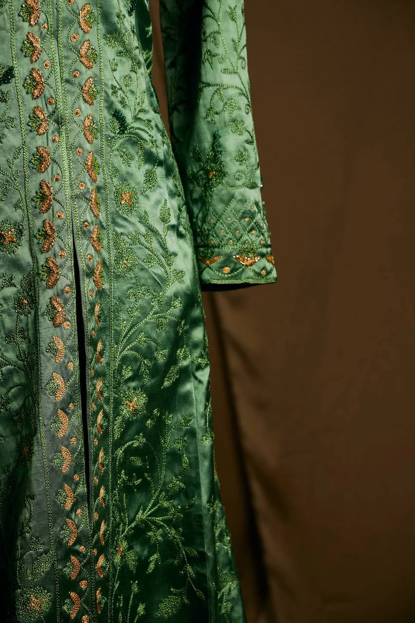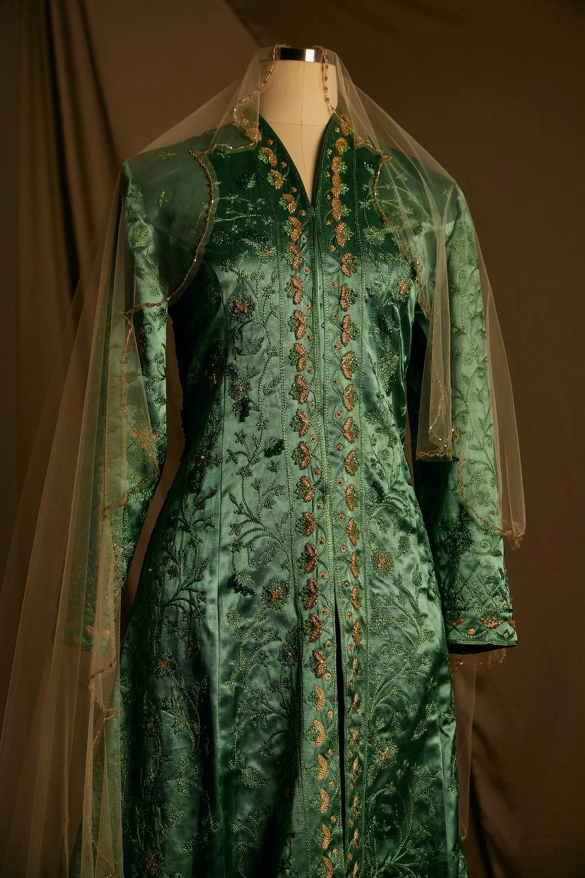 The “Shahstan” kaftan dress embodies refined elegance and artisanal craftsmanship. Every element is carefully hand-stitched, forming a delicate pattern that highlights the precision and character of traditional couture work. The luxurious silhouette flows effortlessly, blending cultural heritage with a modern sense of beauty.