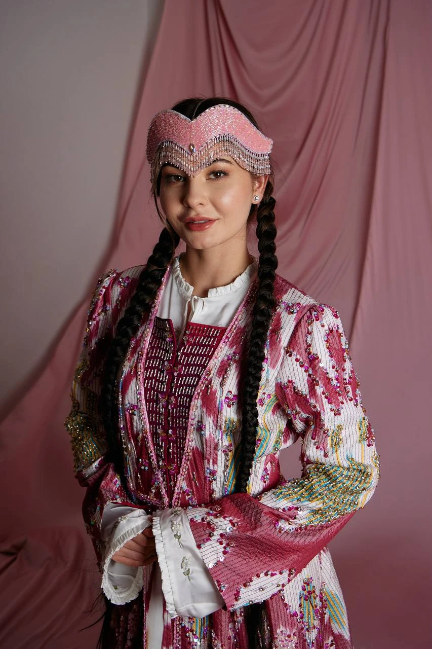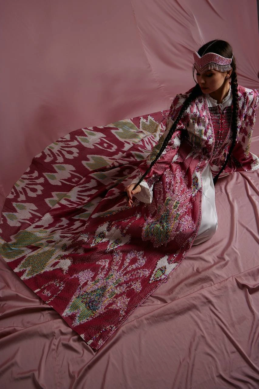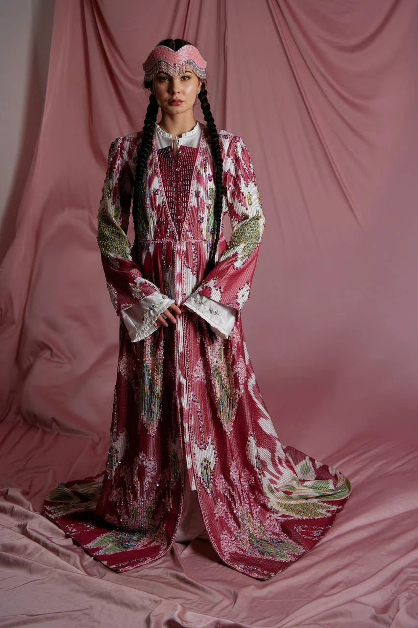 A journey into Eastern elegance with a modern spirit — the “Tamanno” kaftan dress is crafted from 100% natural Adras, a unique hand-woven Uzbek textile where every thread holds the warmth of tradition and the mastery of centuries-old weaving techniques. The soft rose shade enhances its feminine nature, creating a look that feels both poetic and powerful.