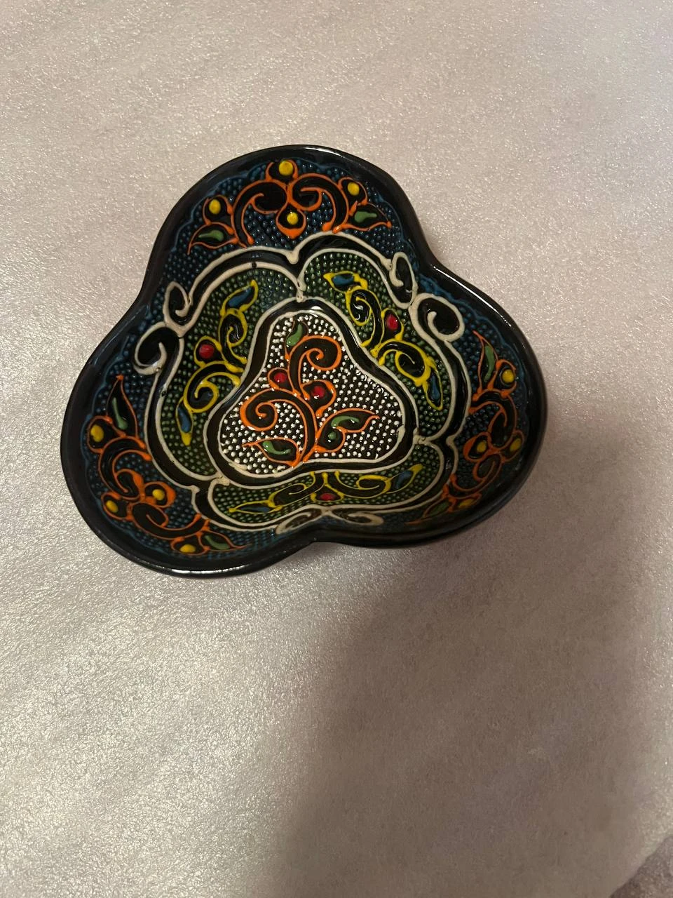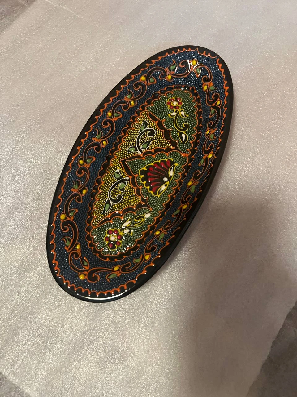 Handcrafted ceramic collection inspired by Uzbek traditional art. Each piece is carefully decorated with intricate oriental patterns, floral motifs, and vibrant color accents created using a dotted relief painting technique. The glossy black finish highlights the rich contrast of turquoise, gold, red, and green decorative details, making every item a unique work of craftsmanship. These ceramics are made from high-quality clay, shaped with precision, and finished by skilled artisans. The artistic design reflects cultural heritage and brings an elegant, timeless aesthetic suitable for both home décor and functional use. Every piece carries a handmade charm, ensuring no two items are exactly the same. A perfect blend of tradition, art, and practicality—crafted to add warmth, beauty, and authenticity to any space.