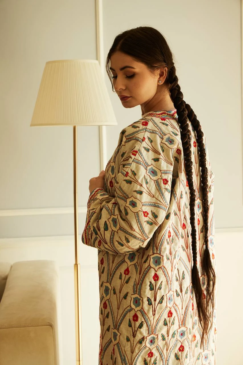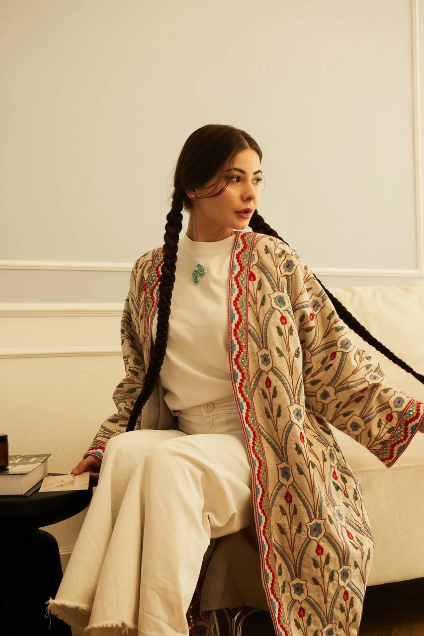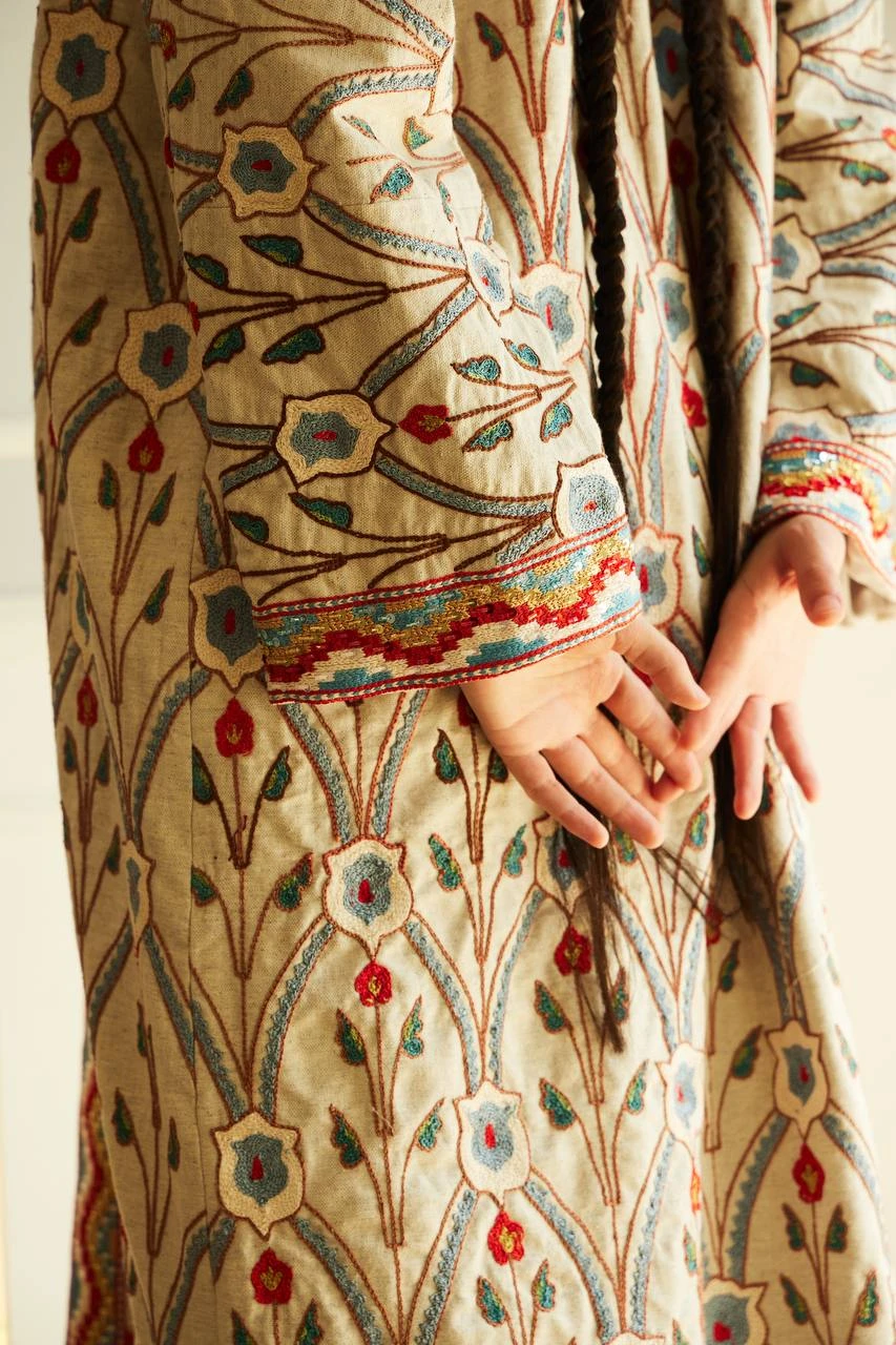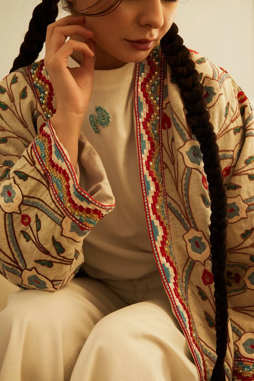 The embroidery is executed in the traditional Suzani style, using natural silk threads, where each motif carries cultural meaning and aesthetic precision. Delicate beadwork and hand-placed sequins add a subtle shimmer, creating depth without overwhelming the clean structure of the garment. Every stitch is applied by hand, capturing the rhythm of artisan work — a dialogue between heritage, patience and artistry.