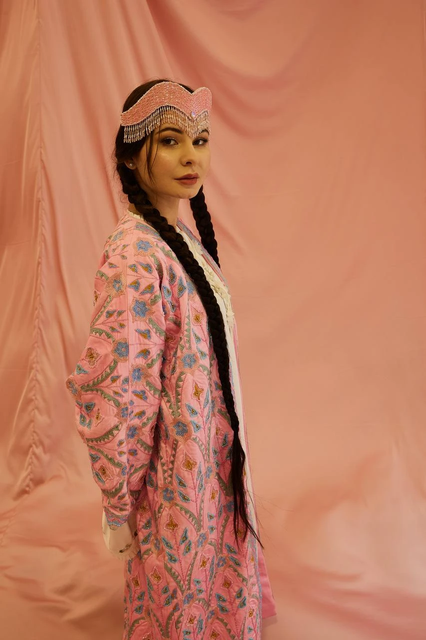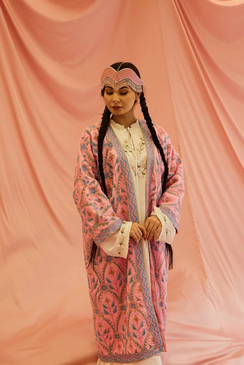 The soft rose tone of the chapan is more than a color — it is tenderness expressed through silk. It represents feminine calmness, quiet strength, and inner warmth. On the body, the chapan feels weightless — like a story told in fabric, glass beads, and soul.
