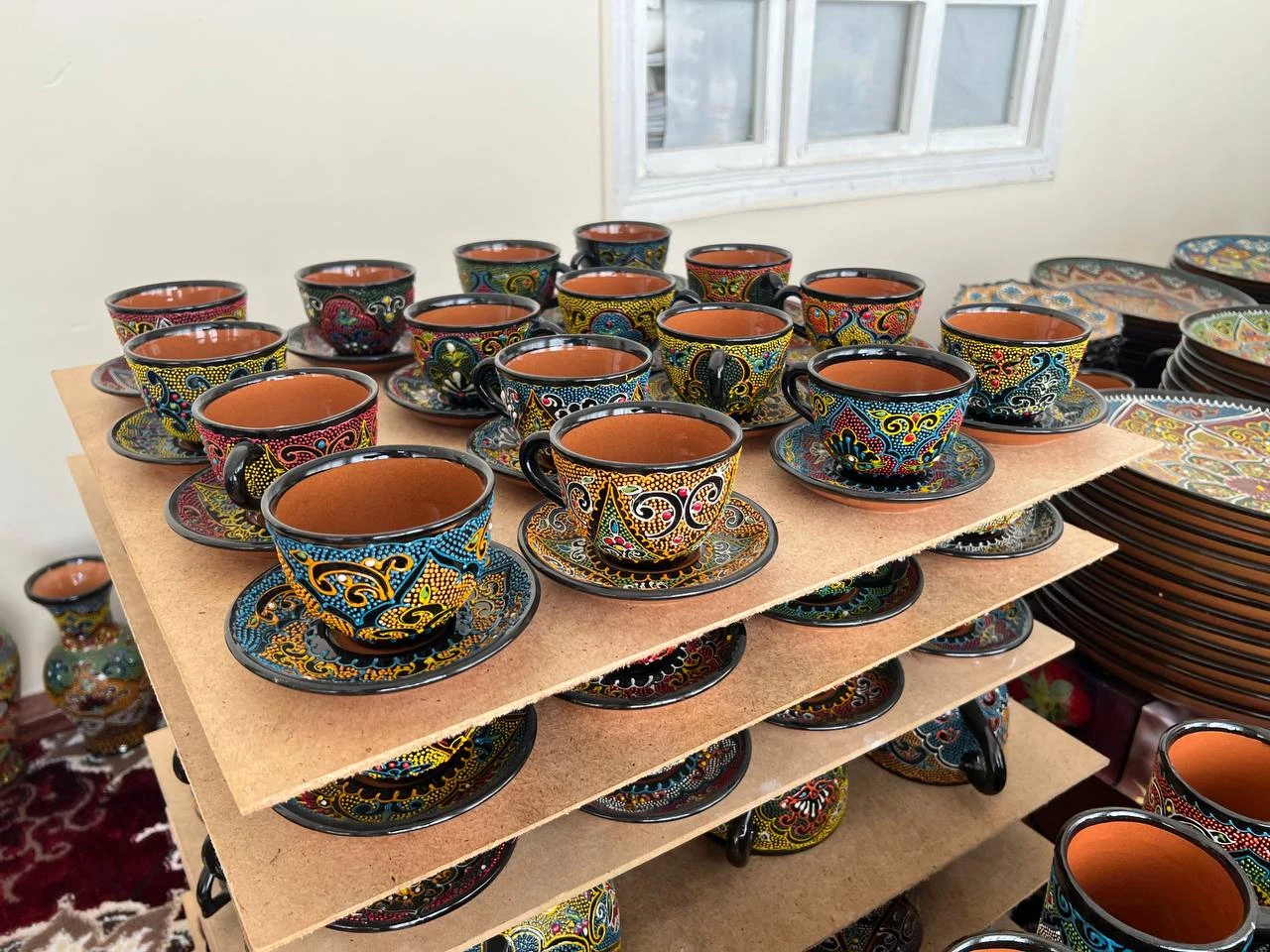 This is a handcrafted Uzbek ceramic tea set made in a traditional artisanal style. The set contains: 1 teapot 6 tea cups (piyala/chashka) 1 round serving tray 1 teapot lid with a decorative ceramic knob Shape & Structure The teapot has a rounded body, a curved ergonomic handle, and a long pouring spout for comfortable serving. The cups are bowl-shaped, wide at the top, narrowing at the bottom, with a smooth inner surface. The tray is circular and stable, designed to hold all pieces securely in one place. Design & Ornamentation The entire set is 100% hand-painted using the traditional dot-pattern (nuqta naqsh) technique. Motifs include: Floral patterns Uzbek paisley (buta) ornaments Geometric decorative borders Star-inspired accents on the teapot surface The patterns are highly detailed and symmetrical, reflecting authentic cultural artistry. Color Palette Primary color: deep cobalt/indigo blue glaze Ornament colors: gold, red, turquoise, green, yellow, and orange accents Interior of cups: smooth natural ceramic clay tone (unpainted, soft beige finish) Material & Craftsmanship Material: high-quality ceramic clay Technique: hand-molded shaping + hand painting Finish: glossy protective glaze coating for durability Heat resistance: suitable for serving hot beverages Uniqueness: each piece may have minor artistic variations due to handmade production Best For Tea or coffee serving Home décor with cultural aesthetics Traditional gift sets Use in cafés, restaurants, hotels, or cultural craft displays Cultural Value This tea set represents Uzbek heritage craftsmanship, blending traditional patterns with elegant hand-painted detail, making it a premium and artistic choice for tea lovers and interior styling.