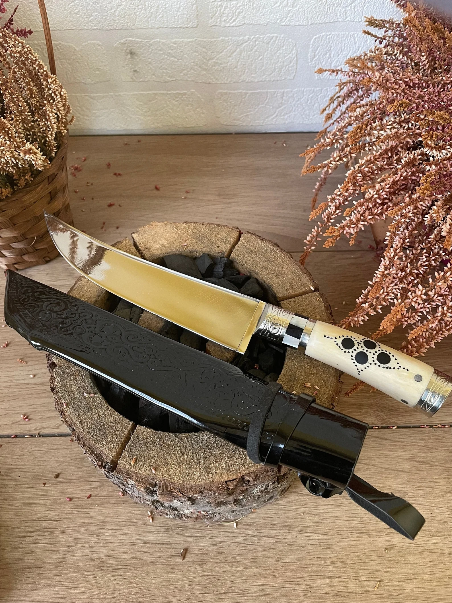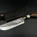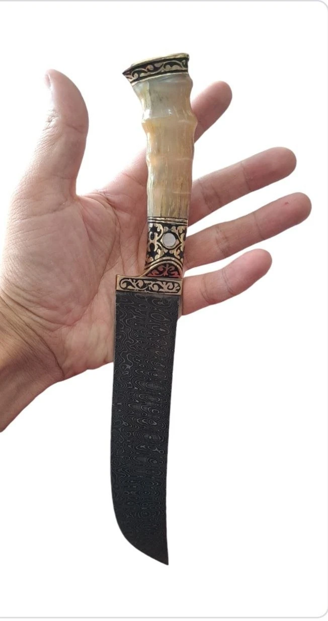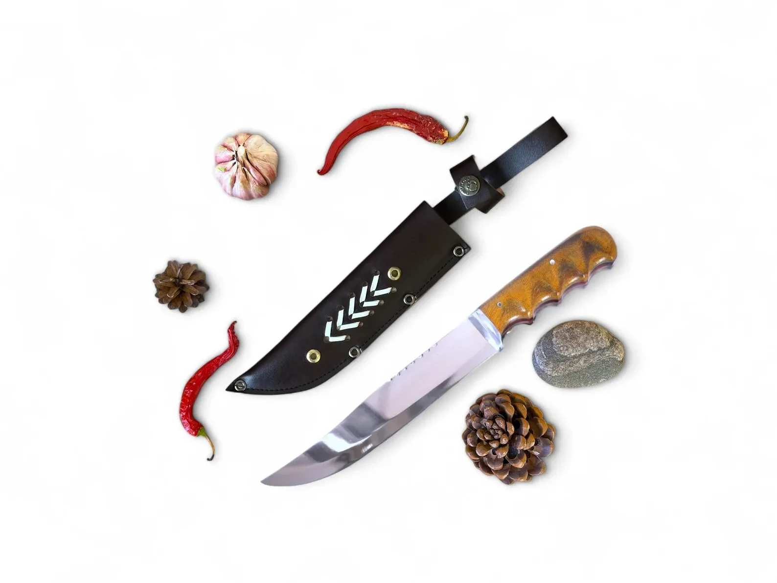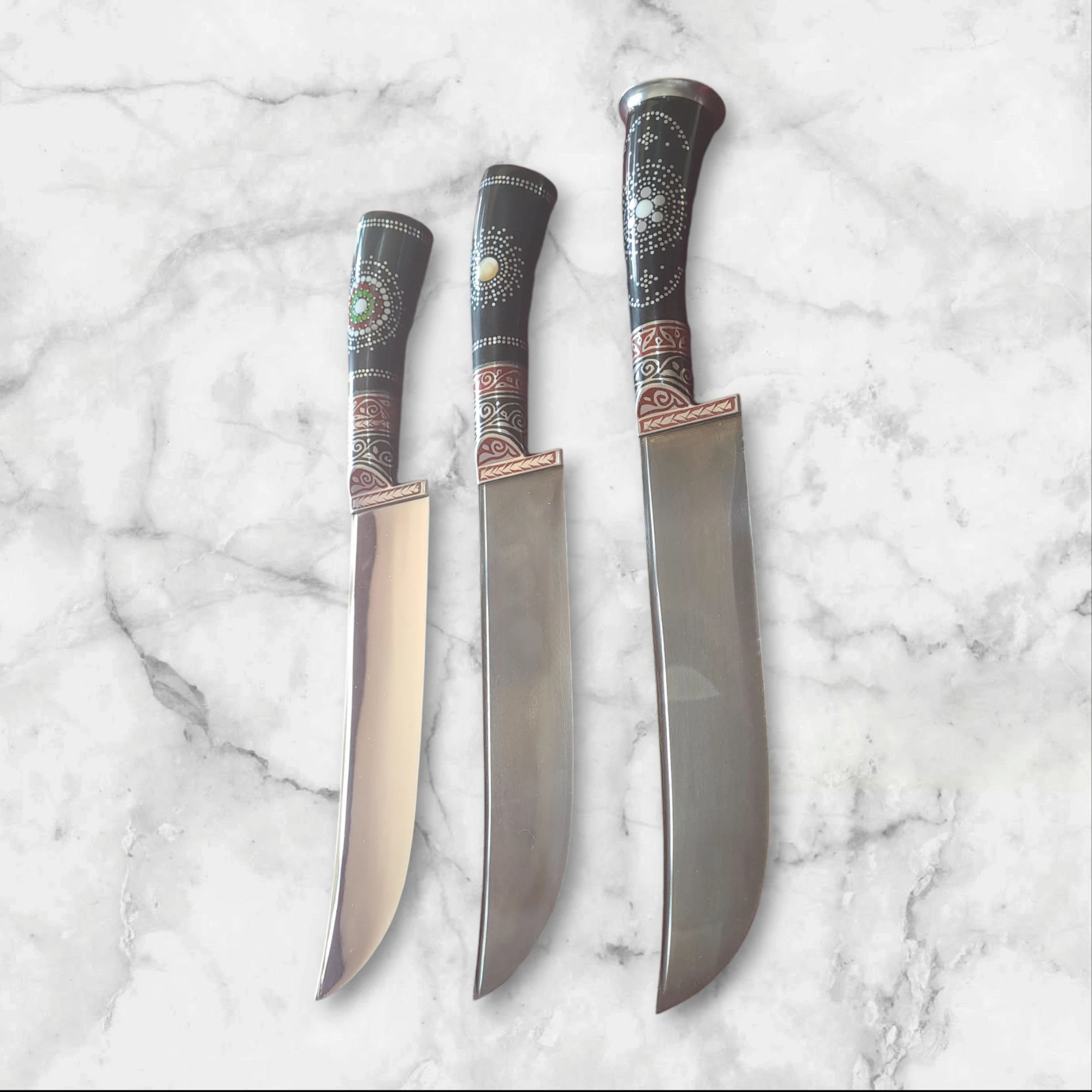 Handcrafted traditional kitchen knives with SHX15 steel blade and valve stainless metal handle, featuring an ornate plexiglass design and brass collar. Total length: 16-17 cm, handle length: 12 cm.