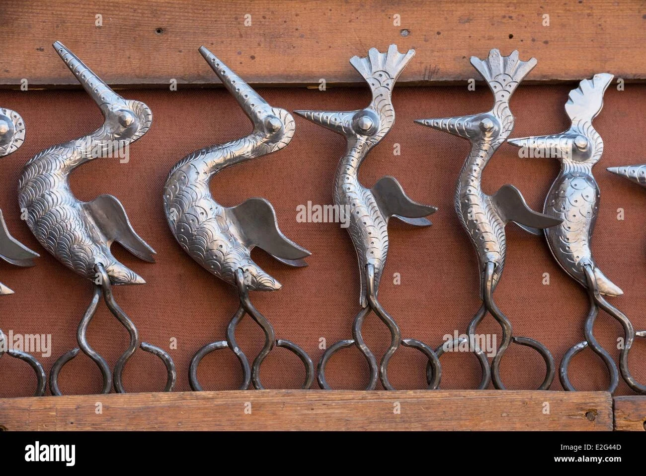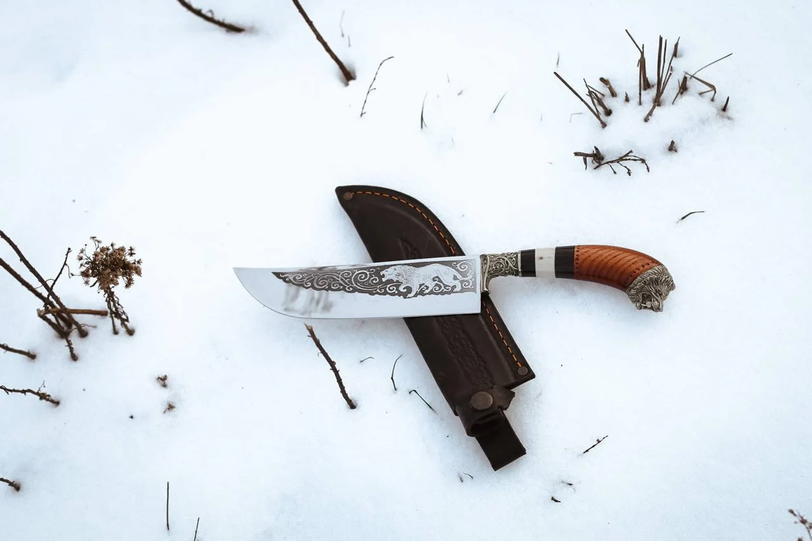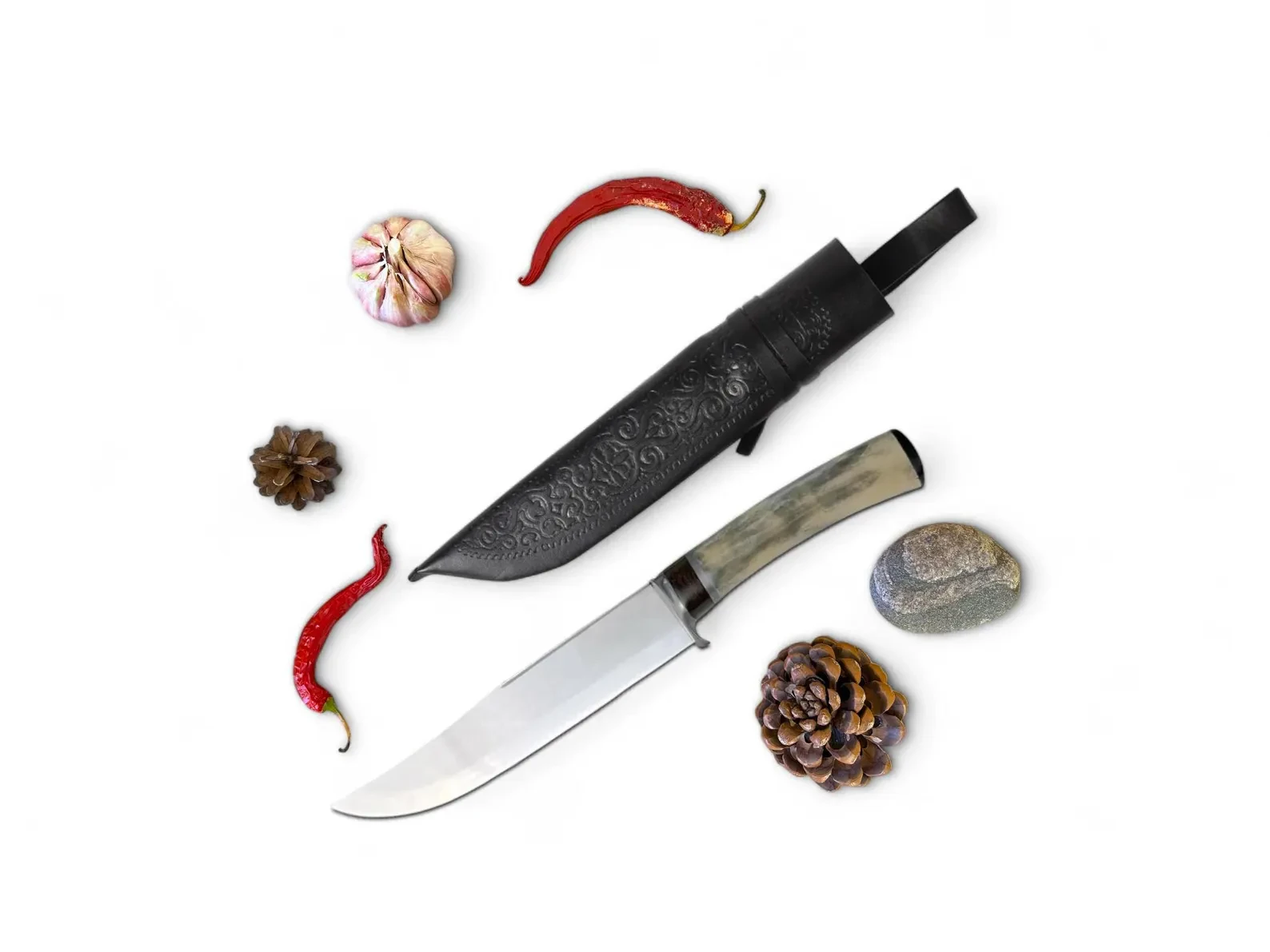 Handcrafted traditional kitchen knives with SHX15 steel blade and valve stainless metal handle, featuring an ornate plexiglass design and brass collar. Total length: 16-17 cm, handle length: 12 cm.