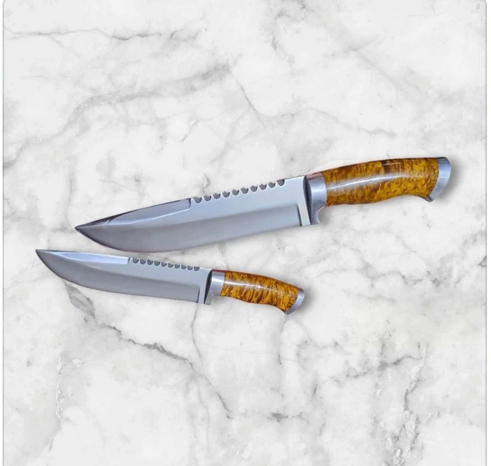 This beautifully crafted Damascus steel knife features a blade length of 17 to 18 cm and a handle measuring 12 cm. The handle is made from a combination of natural horn and wooden materials, enhanced with Babbitt and brass elements, providing both aesthetic appeal and durability.