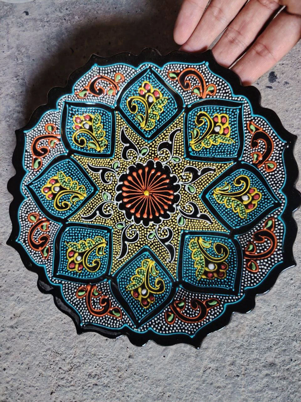This is a handcrafted Uzbek ceramic decorative plate (lagan) featuring a traditional ethnic art design with high precision and detailed ornamentation. Design & Appearance Center inscription: painted text reading “Tashkent.” in a decorative Uzbek calligraphy style Shape: round plate with a scalloped (wave-style) raised rim Main motifs: Uzbek paisley (buta) Symmetrical floral patterns Hand-painted dot ornamentation Decorative mandala-style central composition Traditional curved vine ornaments (islimiy naqsh) around the body Pattern layout: fully symmetrical and layered, representing authentic cultural aesthetics Color Palette Base glaze color: deep glossy black Ornament colors: gold, yellow, red, orange, turquoise, indigo, and green accents Texture style: dense decorative dotwork background, giving a rich and premium artistic look Material & Craftsmanship Material: natural ceramic clay Technique: 100% hand-molded and hand-painted Finish: glossy protective glaze coating for long-lasting durability Uniqueness: each plate has minor natural variations due to handmade production Purpose: decorative art piece (liquid serving not recommended unless inner coated) Best For Home interior décor (traditional or modern spaces) Cultural display in cafés, hotels, offices, and galleries Heritage-style premium gifts Table styling for dry foods or sweets (decorative use priority) Cultural Value This plate reflects the heritage of Uzbek ceramic artistry, specifically honoring the city of Tashkent, and is crafted for customers who value authentic handmade ethnic décor with premium artistic detail.