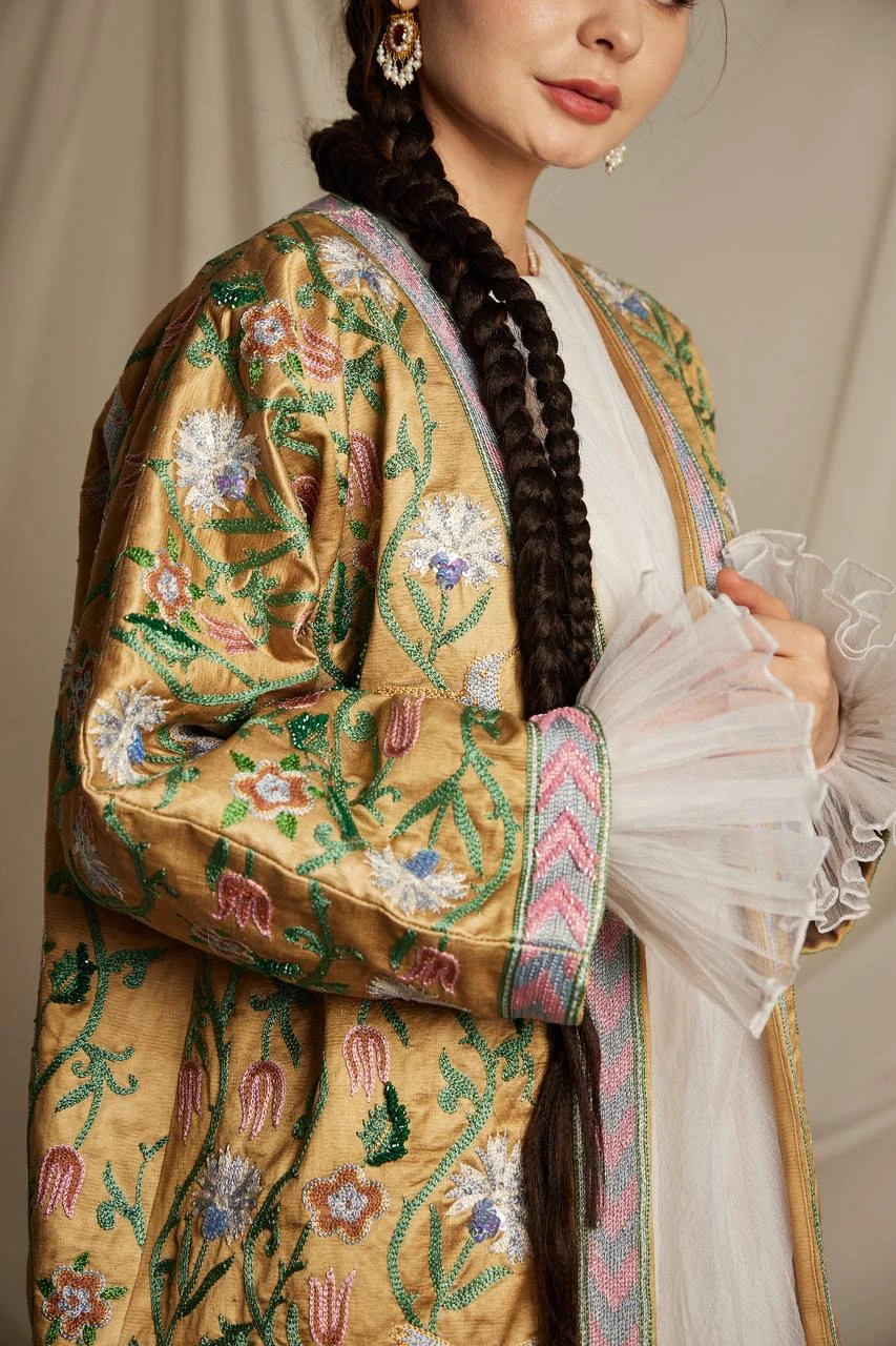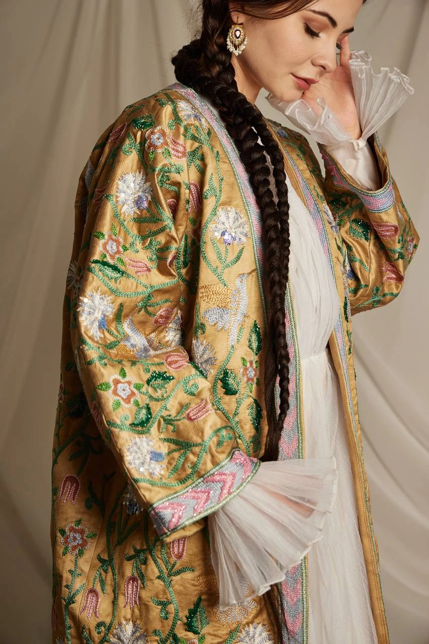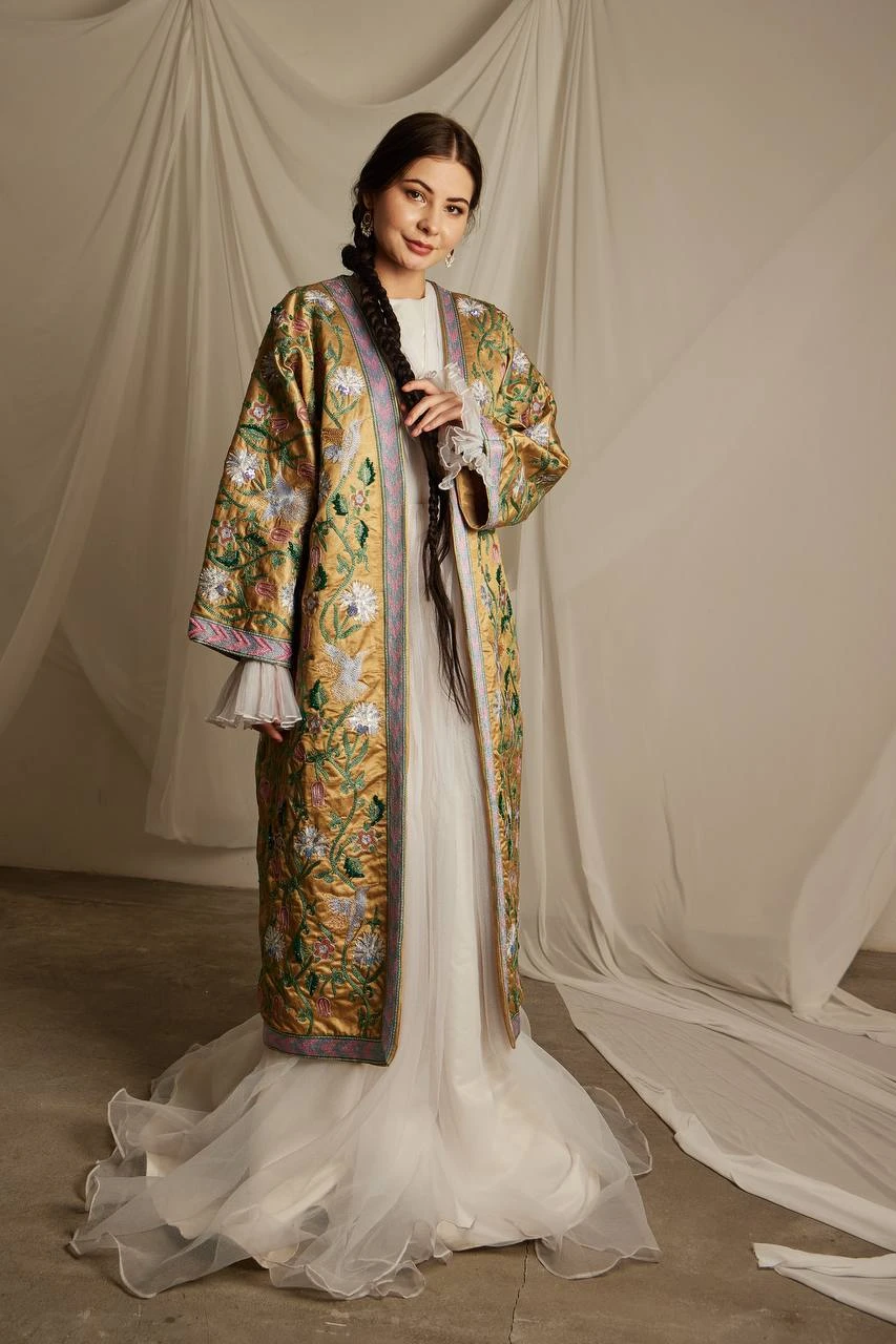 The fabric of “Zargul” is premium satin silk, chosen for its smooth texture, noble shine, and natural drape. Under the light, the surface reflects a soft glow, enhancing the hand embroidery and revealing the raised texture of each silk thread. The entire chapan is made by hand, without industrial shortcuts — the lining, threadwork, pattern composition, and finishing touches are all done with care and intention. This gives the garment a rare artistic energy and one-of-a-kind identity: no two “Zargul” pieces are exactly the same, making each one a wearable artwork. Designed in an author’s style, “Zargul” combines historical silhouettes of the traditional chapan with a modern minimalist form, allowing it to be styled both as a fashion statement and as a symbolic cultural garment. The soft structure and fluid drape of the silk make it feel light on the body while still creating a striking visual presence, whether worn open or belted.
